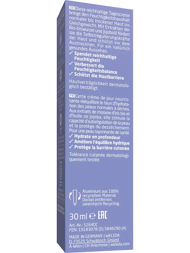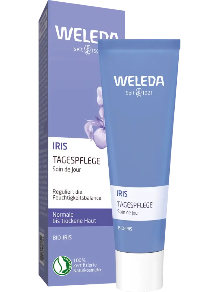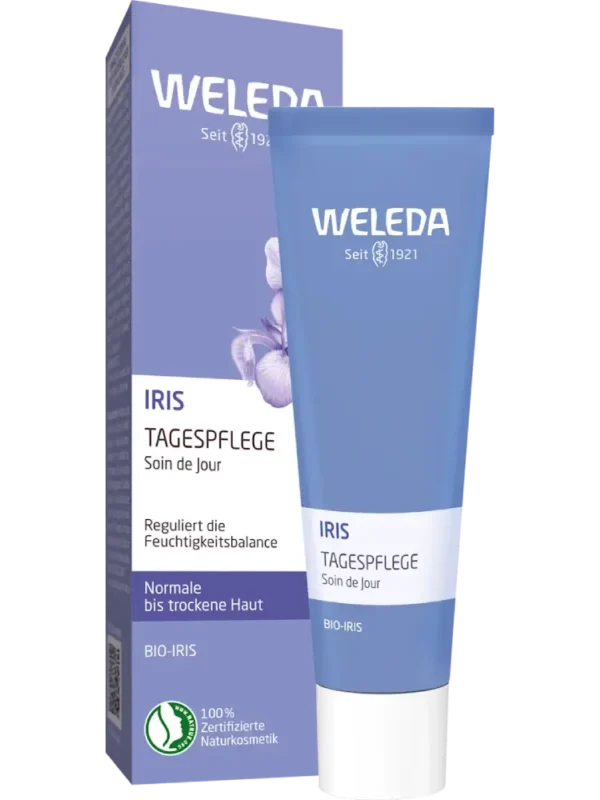 Le soin de jour à l’Iris de Weleda est une crème riche qui procure une sensation de fraîcheur et de confort cutané tout au long de la journée. Enrichie en racine d’iris bio, la crème aide à maintenir l’équilibre hydrique des peaux normales à sèches et les protège du dessèchement.