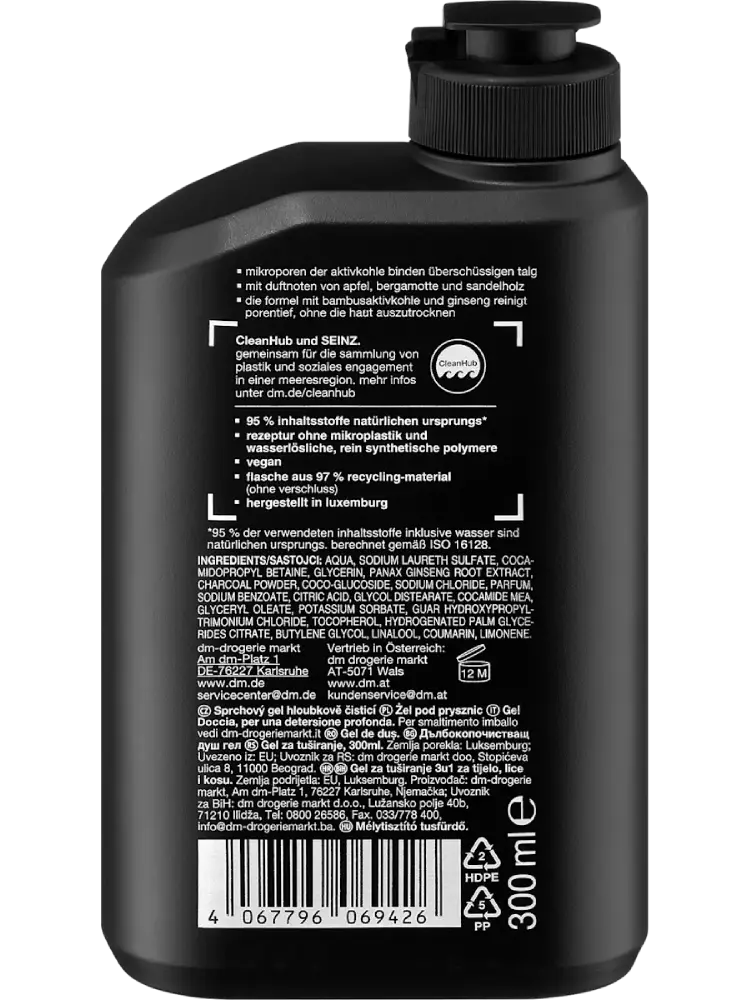 Le gel douche purifiant en profondeur de SEINZ. assure un nettoyage efficace et agréable. Enrichi en notes parfumées soigneusement sélectionnées de pomme, de bergamote et de bois de santal, il offre une expérience olfactive unique. Grâce à sa formule spéciale au charbon actif de bambou et au ginseng, il nettoie la peau en profondeur sans la dessécher.