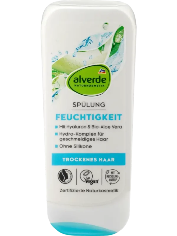 تم تطوير بلسم الترطيب Aloe Vera & Hyaluron من alverde NATURKOSMETIK خصيصًا لتلبية احتياجات الشعر الجاف والمتقصف. تحتوي تركيبته على مركب ترطيب من حمض الهيالورونيك والألوفيرا والجلسرين من أصل طبيعي يساعد على حماية أطراف الشعر من الجفاف، وتنعيم بنية الشعر، ويمنح الشعر نعومة حريرية وسهولة في التمشيط