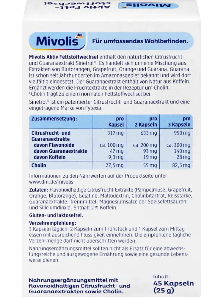 يحتوي Mivolis Aktiv Fettstoffwechsel على مستخلص طبيعي من الحمضيات والغوارانا Sinetrol. وهو مزيج من مستخلصات البرتقال الأحمر والجريب فروت والبرتقال والغوارانا. يُعرف الغوارانا منذ قرون في منطقة الأمازون ويُستخدم هناك بطرق متعددة. يحتوي مستخلص الغوارانا بشكل طبيعي على الكافيين. كما أُضيف الكولين إلى التركيبة إلى جانب مستخلصات الفواكه.