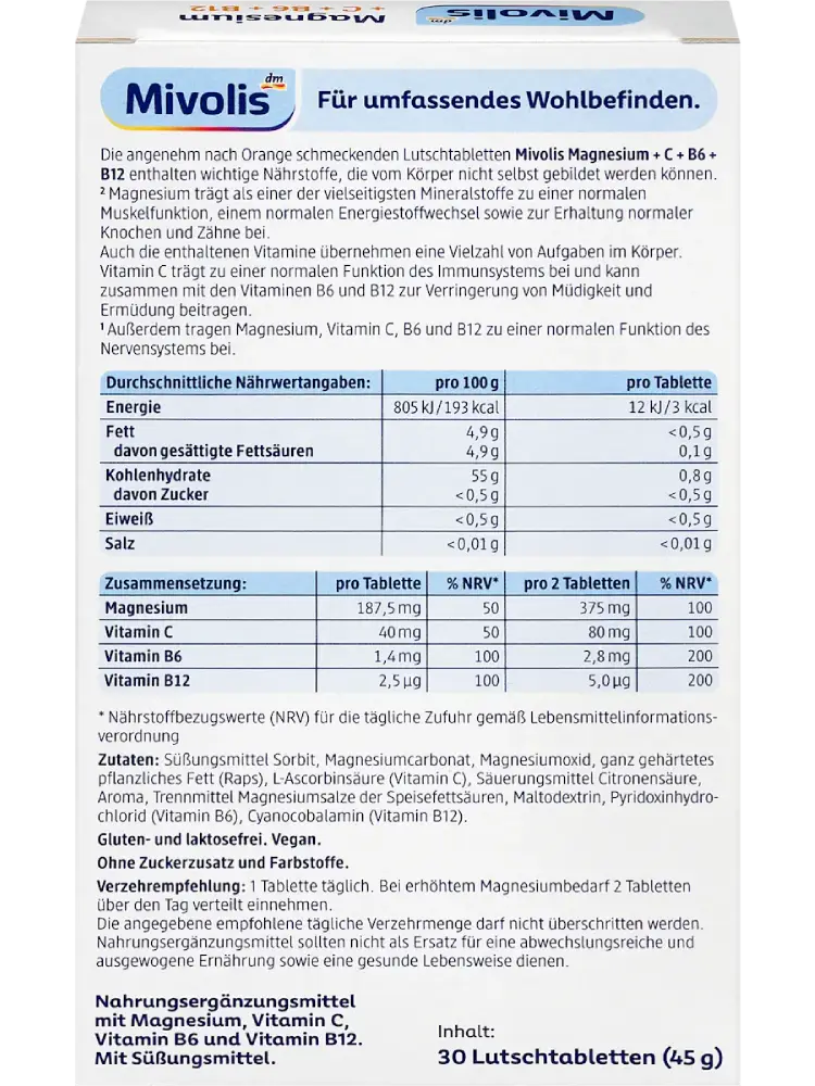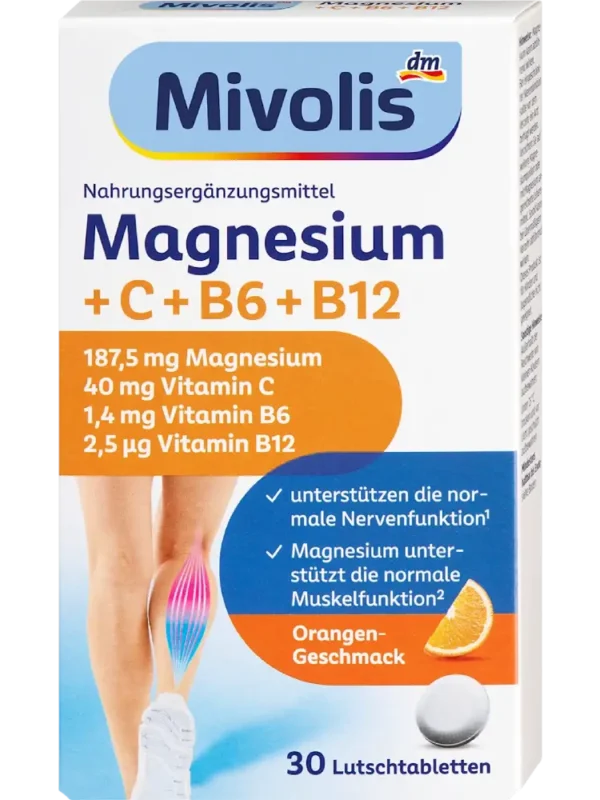 تحتوي أقراص المص Mivolis Magnesium + C + B6 + B12 ذات المذاق اللطيف بالبرتقال على عناصر غذائية مهمة لا يستطيع الجسم إنتاجها بنفسه.