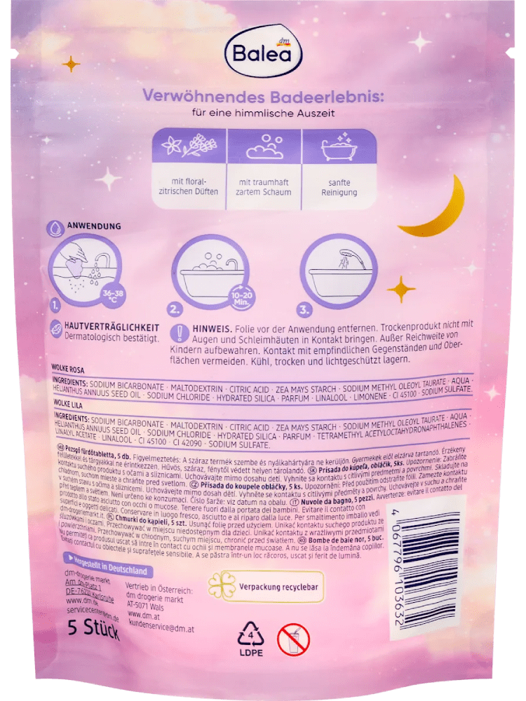توفر سحب الاستحمام من Balea تنظيفًا لطيفًا للبشرة. يتميز هذا المكون برائحة زهرية حمضية ويمنح رغوة ناعمة ورقيقة. كما يوفر تجربة استحمام مريحة وممتعة.