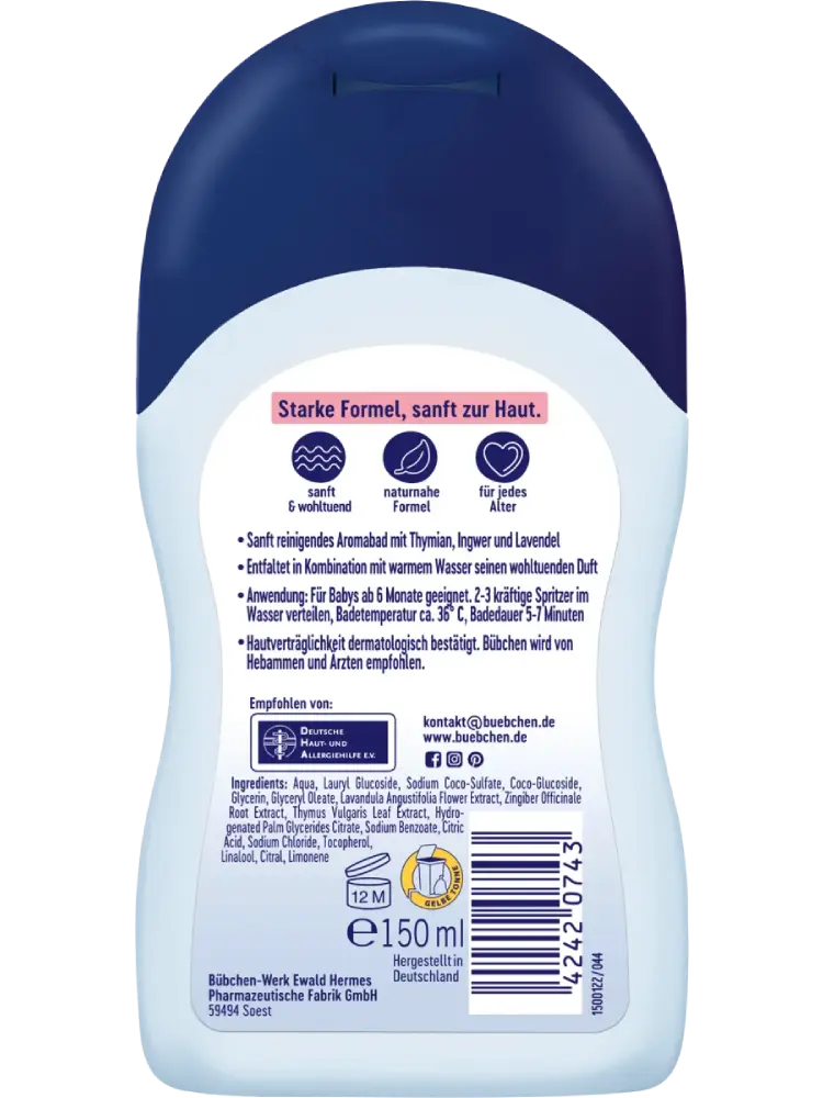 Le bain SOS période de rhume de Bübchen nettoie en douceur la peau délicate des bébés à partir de six mois tout en offrant un soin apaisant. La combinaison de thym, de gingembre et de lavande est parfaite pendant la saison froide et enveloppe votre petit trésor d’un parfum agréable.