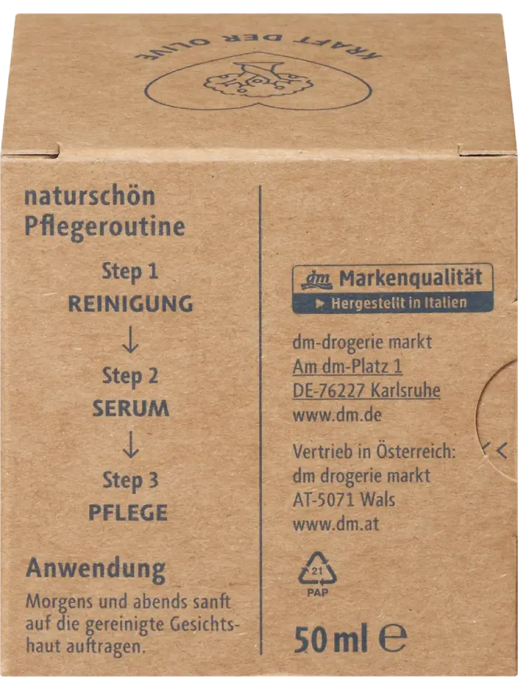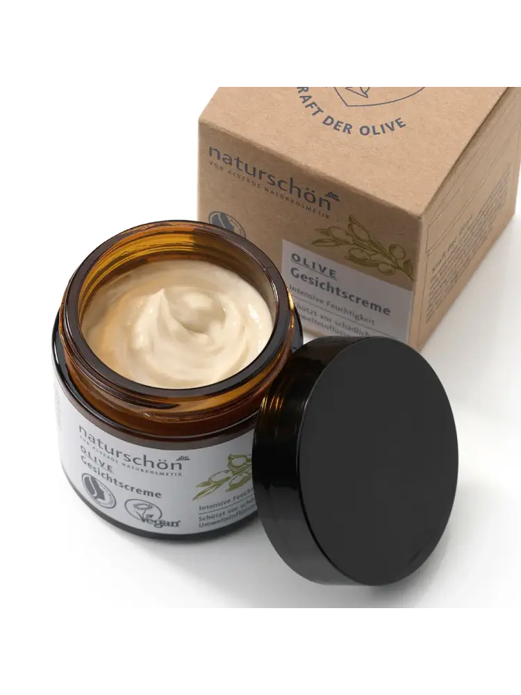 La crème visage Naturschön d’alverde COSMÉTIQUE NATURELLE réunit la force originelle de l’olivier dans un soin visage. Les extraits de fruit et de feuille d’olivier protègent et activent les cellules grâce à leurs polyphénols naturels et peuvent ainsi aider la peau à paraître plus jeune plus longtemps. La précieuse huile d’olive apporte hydratation et souplesse.