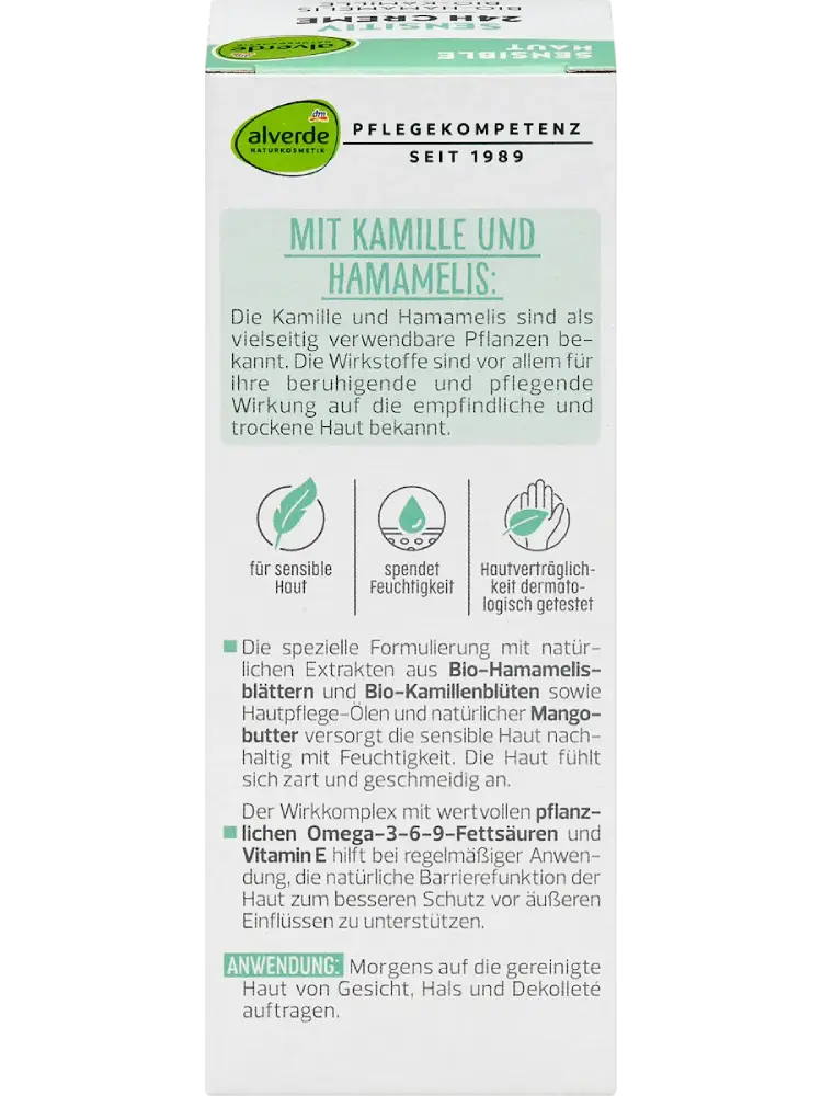 Découvrez la crème visage Sensitive de alverde Cosmétique Naturelle, à base de camomille et d’hamamélis, deux plantes reconnues pour leurs multiples bienfaits.