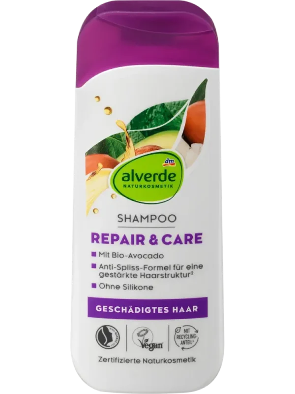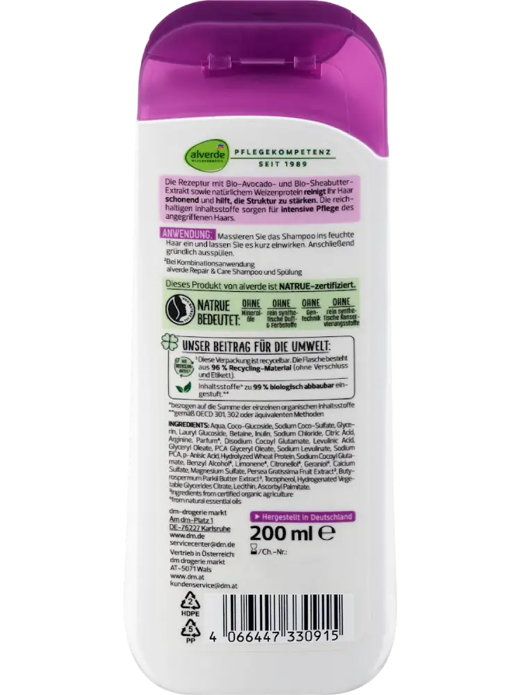 شامبو الإصلاح بالأفوكادو العضوي وزبدة الشيا العضوية من alverde لمستحضرات التجميل الطبيعية ينظف الشعر بلطف ويساعد على تقوية بنيته بفضل تركيبته التي تحتوي على مستخلصات الأفوكادو العضوي، زبدة الشيا العضوية، وبروتين القمح الطبيعي.