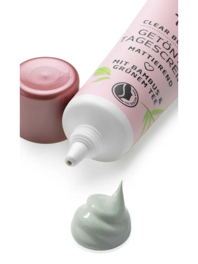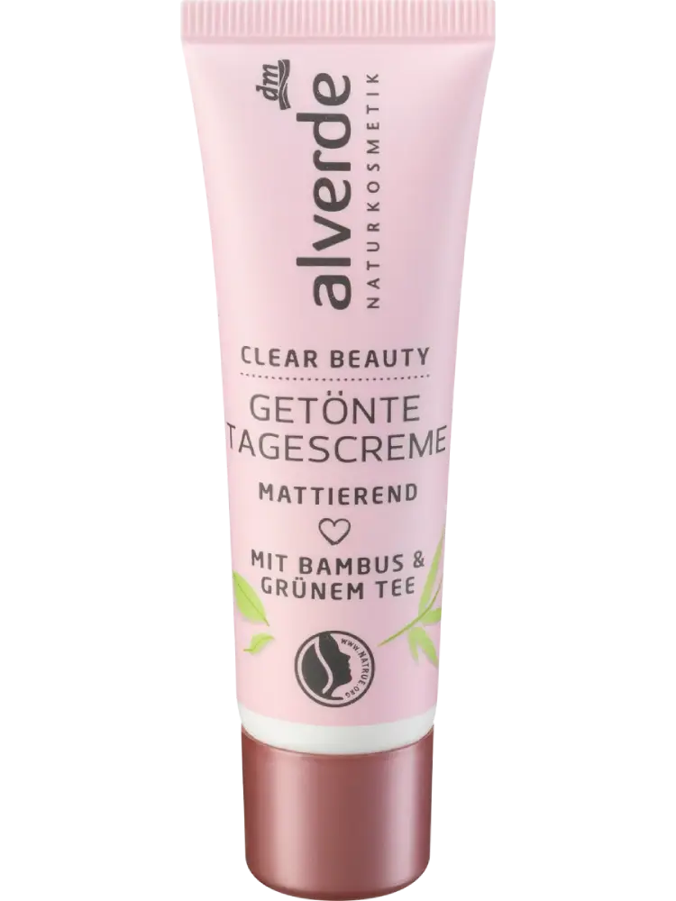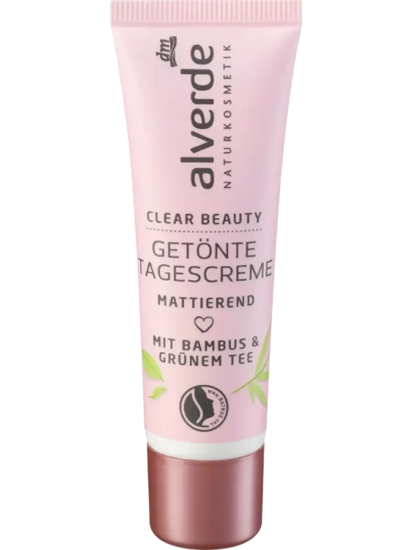 كريم النهار الملوّن Clear Beauty من alverde مستحضرات تجميل طبيعية يحتوي على خلاصة الخيزران والشاي الأخضر، ويتغير لونه عند الدمج من أخضر باهت إلى بيج ليتلاءم مع لون البشرة.