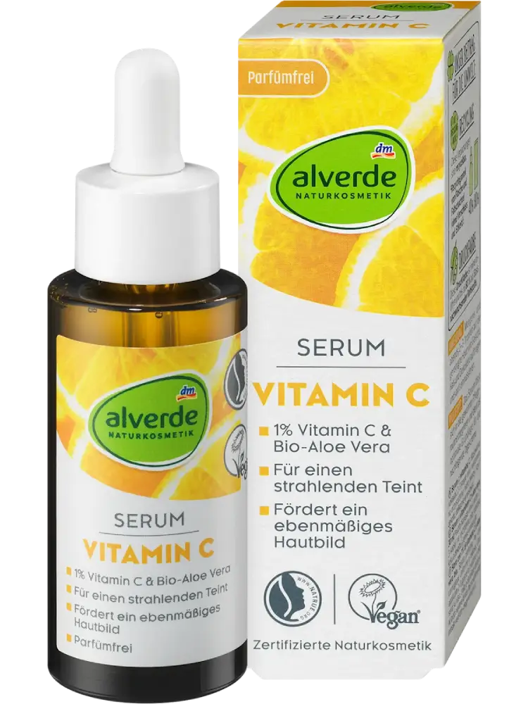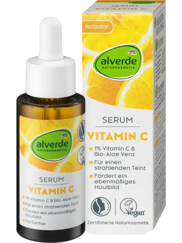 سيروم فيتامين C من alverde NATURKOSMETIK يحتوي، إلى جانب فيتامين C الفعّال، على الألوة فيرا العضوية، مستخلص البرتقال المر وماء العنب، ليمنح البشرة توهّجًا طبيعيًا يوميًا.