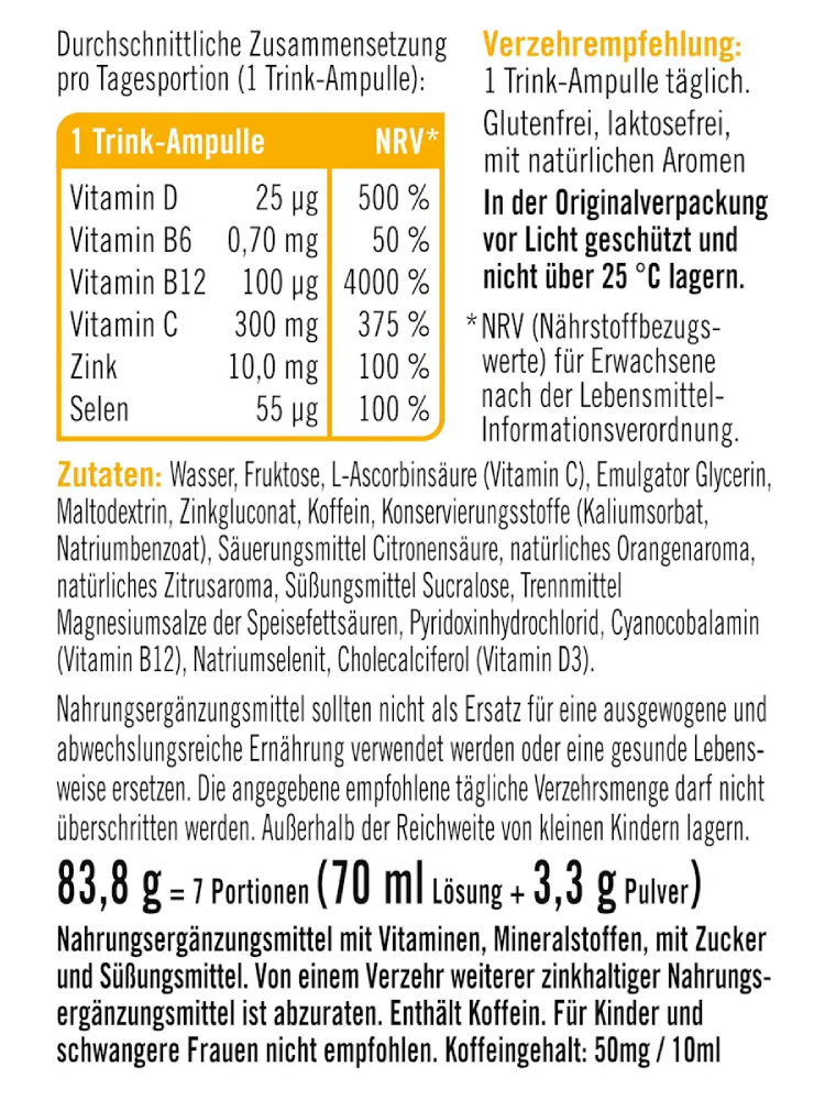 Les ampoules buvables Taxofit Immunité + Énergie soutiennent votre mode de vie actif. En cas d’alimentation déséquilibrée ou de périodes de stress, un apport insuffisant en vitamines et minéraux peut survenir. Une bouteille fraîchement préparée contient des vitamines C et D, du zinc et du sélénium. Ces nutriments aident à soutenir le fonctionnement normal du système immunitaire. La vitamine C, le zinc et le sélénium contribuent également à protéger les cellules du stress oxydatif. Les vitamines B12 et B6 soutiennent le métabolisme énergétique et peuvent aider à réduire la fatigue et l’épuisement. Contient également de la caféine.