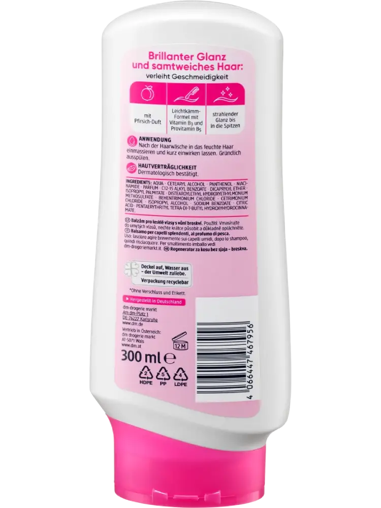 L’après-shampooing Seidenglanz de Balea est spécialement conçu pour les cheveux ternes et sans éclat. Il procure une brillance éclatante à la chevelure. Sa formule enrichie en vitamine B3 et provitamine B5 facilite le démêlage et laisse les cheveux doux et soyeux jusqu’aux pointes.