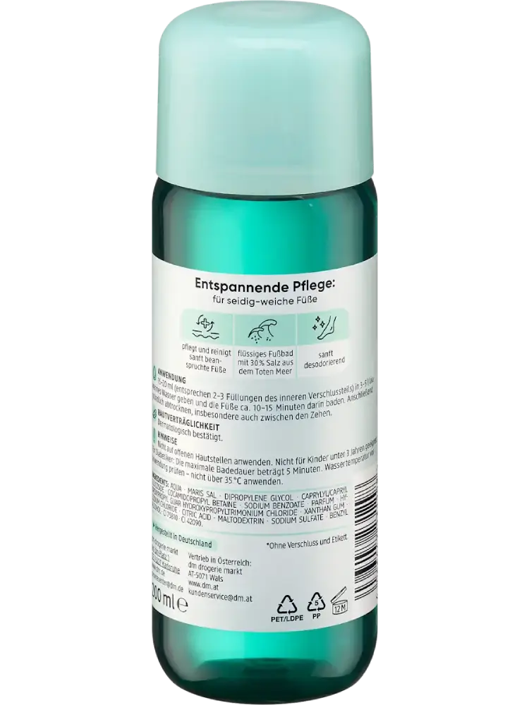 Le bain de pieds liquide Totes Meer de Balea est parfait pour une relaxation totale. Ce bain de pieds, contenant 30 % de sel de la mer Morte, procure une hydratation apaisante et laisse une sensation de douceur. Grâce à son effet désodorisant doux, il aide efficacement à lutter contre les mauvaises odeurs et apporte une fraîcheur revitalisante. La peau est nourrie et les pieds sont parfaitement soignés pour une agréable sensation de confort.