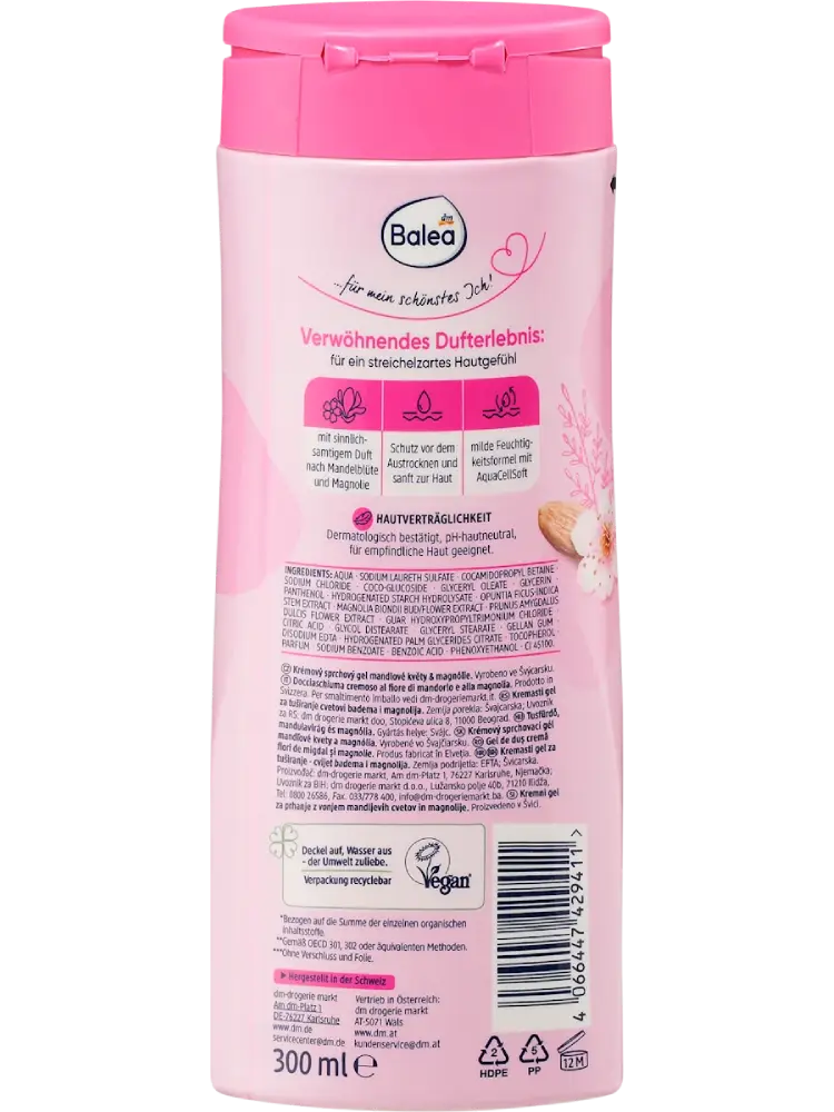 La crème de douche Fleur d’amandier & Magnolia de Balea procure une sensation de peau douce et soyeuse et chouchoute les sens avec un parfum sensuel et velouté de fleur d’amandier et de magnolia. Sa formule aide à protéger la peau contre le dessèchement et convient aux peaux sensibles.