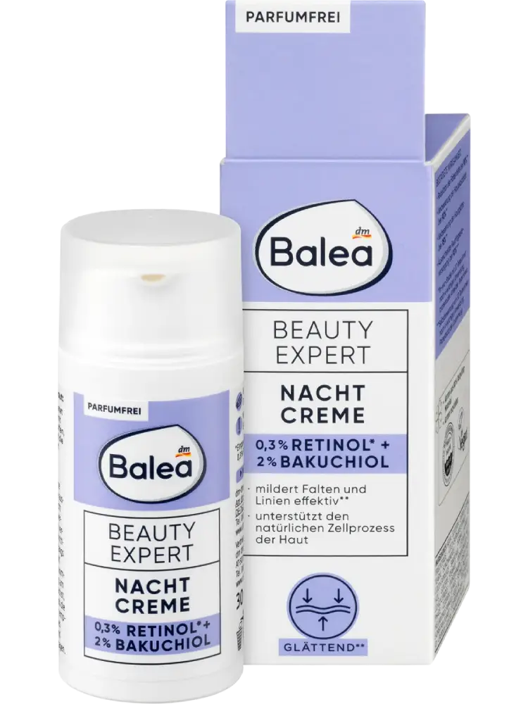 بالبيا بيوتي إكسبرت يقدم عناية فعالة بمكونات مركزة، مصممة خصيصاً لتلبية احتياجاتك – لبشرة مشرقة. الباكوشيول هو بديل نباتي للريتينول. معاً، يقدمان تحسناً ملحوظاً للبشرة. الكريم الليلي مع 0.3% ريتينول* و 2% باكوشيول يخترق الطبقة العليا من البشرة بعمق ويوفر ترطيباً مكثفاً. التركيبة عالية الفعالية تقلل من عمق التجاعيد**، تحسن مرونة البشرة** وتدعم عملية تجديدها.