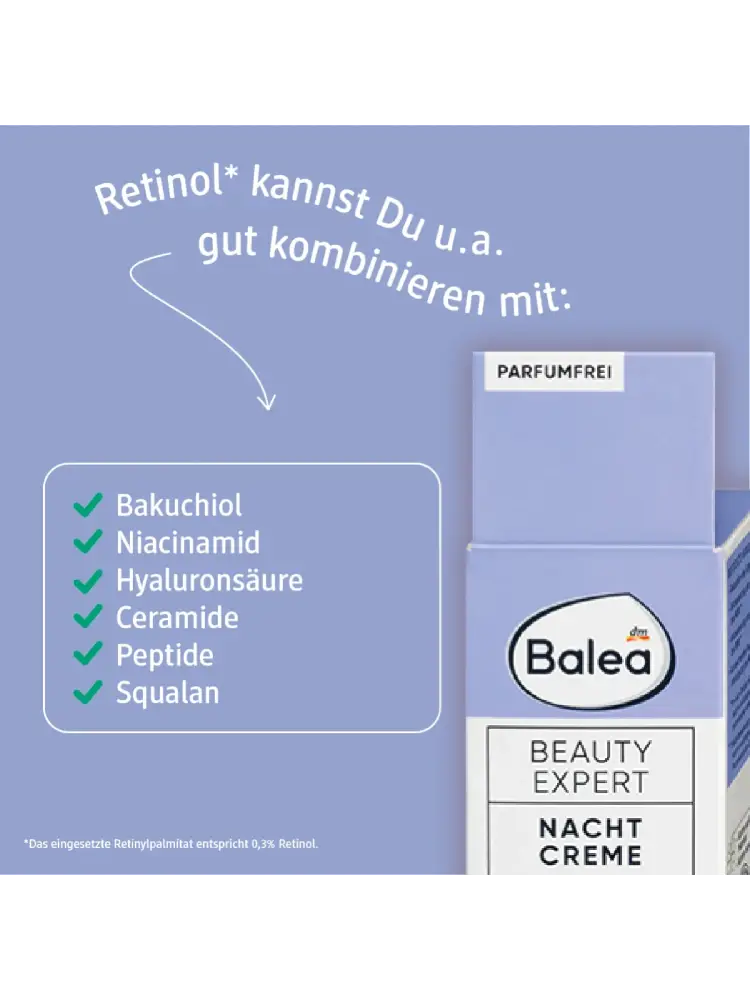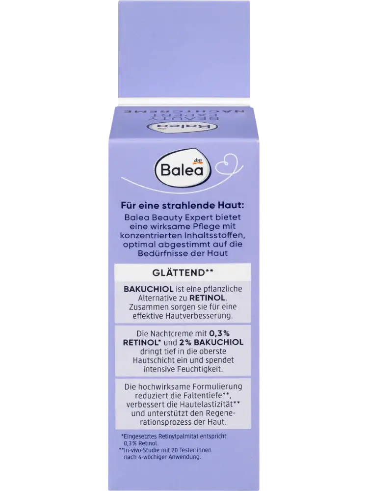 Balea Beauty Expert offre un soin efficace avec des ingrédients concentrés, parfaitement adaptés à vos besoins – pour une peau éclatante. Le bakuchiol est une alternative végétale au rétinol. Ensemble, ils assurent une amélioration visible de la peau. La crème de nuit, avec 0,3 % de rétinol* et 2 % de bakuchiol, pénètre en profondeur dans la couche supérieure de la peau et apporte une hydratation intense. La formule hautement efficace réduit la profondeur des rides**, améliore l’élasticité de la peau** et soutient son processus de régénération.