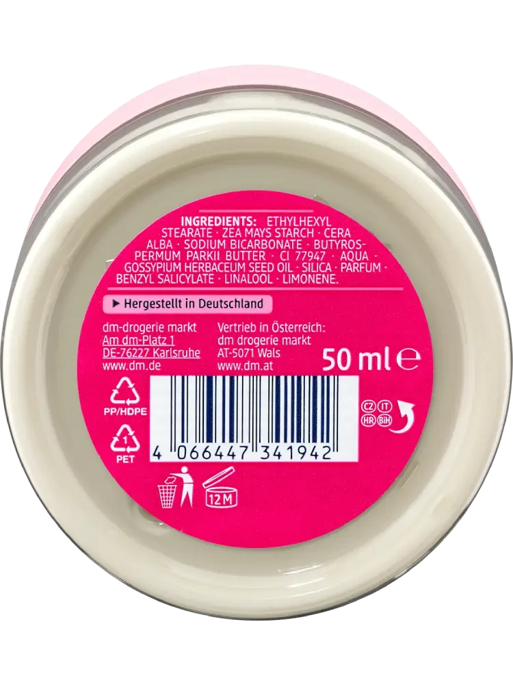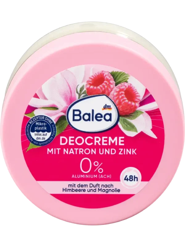 La formule économique de la crème déodorante Balea à la framboise, avec bicarbonate de sodium et zinc, offre une protection déodorante jusqu’à 48 heures. Grâce au bicarbonate d’origine naturelle, sa texture au parfum fruité prend soin des aisselles. De plus, sa formule sans aluminium lutte efficacement contre la décomposition de la transpiration et la formation des mauvaises odeurs.