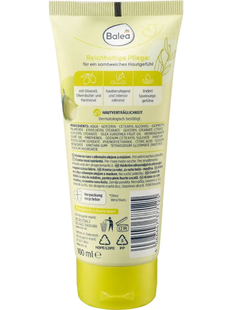La crème pour les mains Olive de Balea rend les mains agréablement douces et souples. Sa formule de soin nourrit la peau abîmée et sèche et réduit les sensations de tiraillement. Enrichie en huile d’olive naturelle, en précieux beurre d’olive et en panthénol, elle prend soin de la peau de manière intensive.