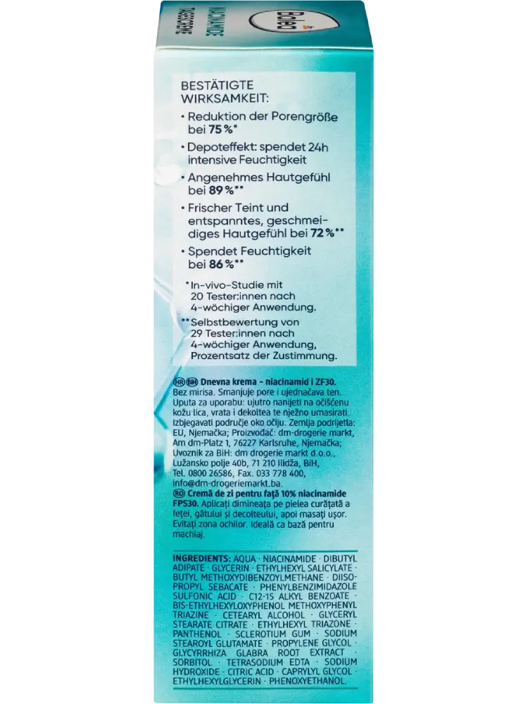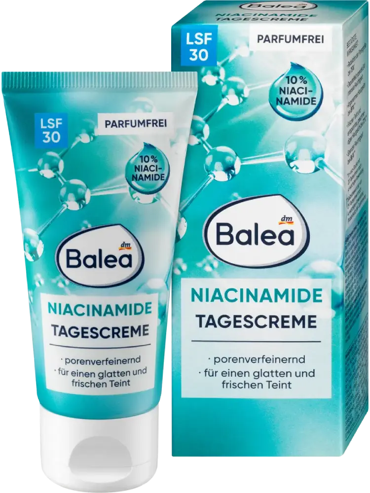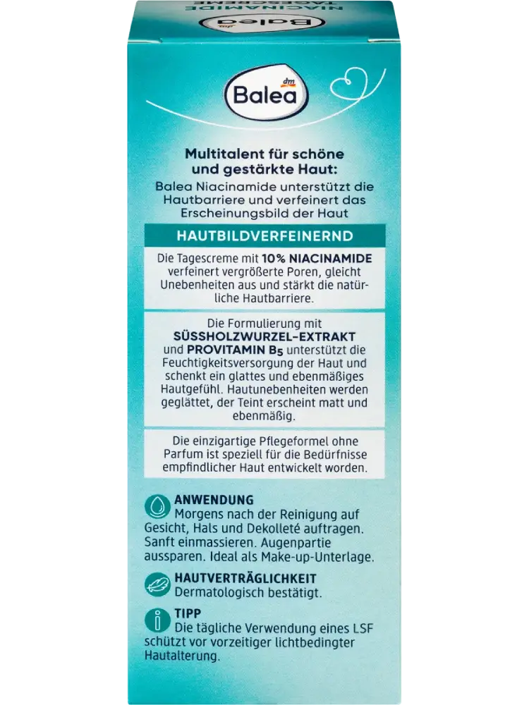 La crème de jour Balea Niacinamide SPF 30 affine le grain de peau, lisse la surface cutanée et réduit la taille des pores. Sa formule précieuse, enrichie à 10 % de niacinamide, resserre les pores dilatés, corrige les irrégularités et soutient la barrière naturelle de la peau. L’extrait de racine de réglisse et la provitamine B favorisent l’hydratation de la peau et procurent une sensation de douceur et d’uniformité. Les irrégularités cutanées sont estompées, le teint paraît mat et homogène. Sa formule unique, sans parfum, a été spécialement développée pour répondre aux besoins des peaux sensibles.