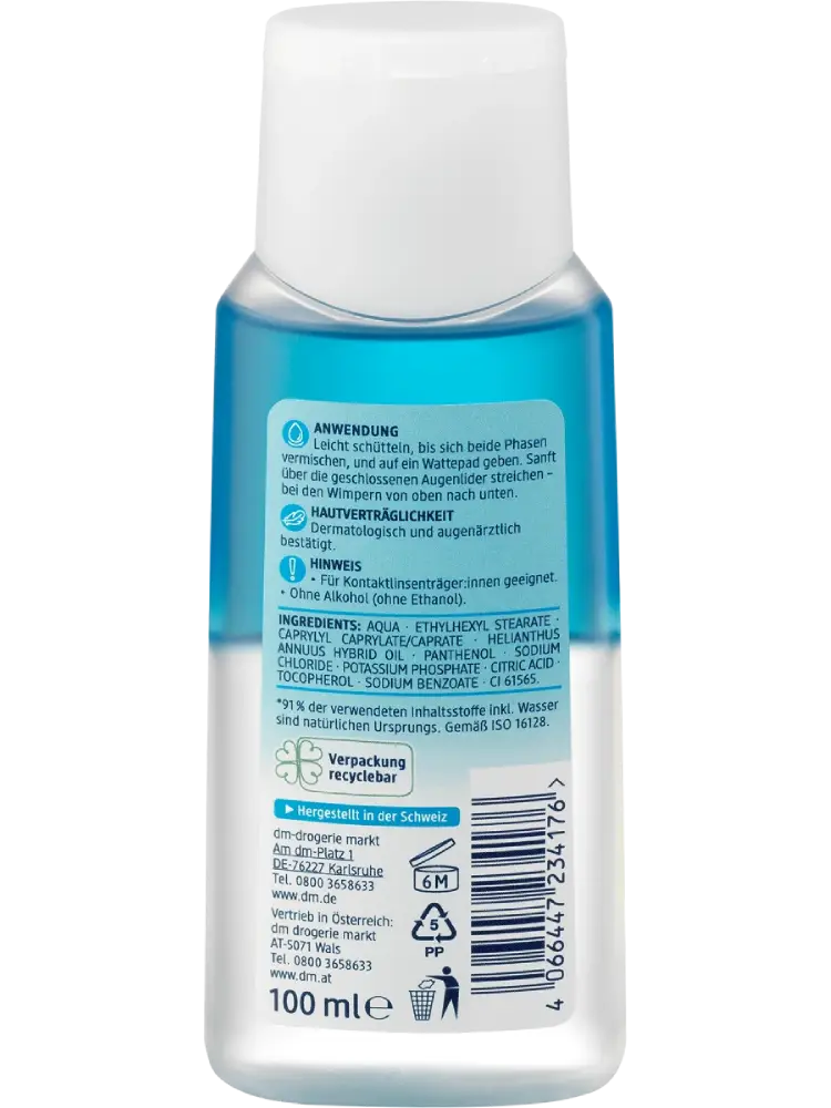 مزيل مكياج العيون من Balea ينظف بلطف وسرعة. تم اختبار توافقه مع البشرة والعيون dermatologically وطبياً. مناسب لمستخدمي العدسات اللاصقة. مكوناته بنسبة 91٪ من أصل طبيعي.