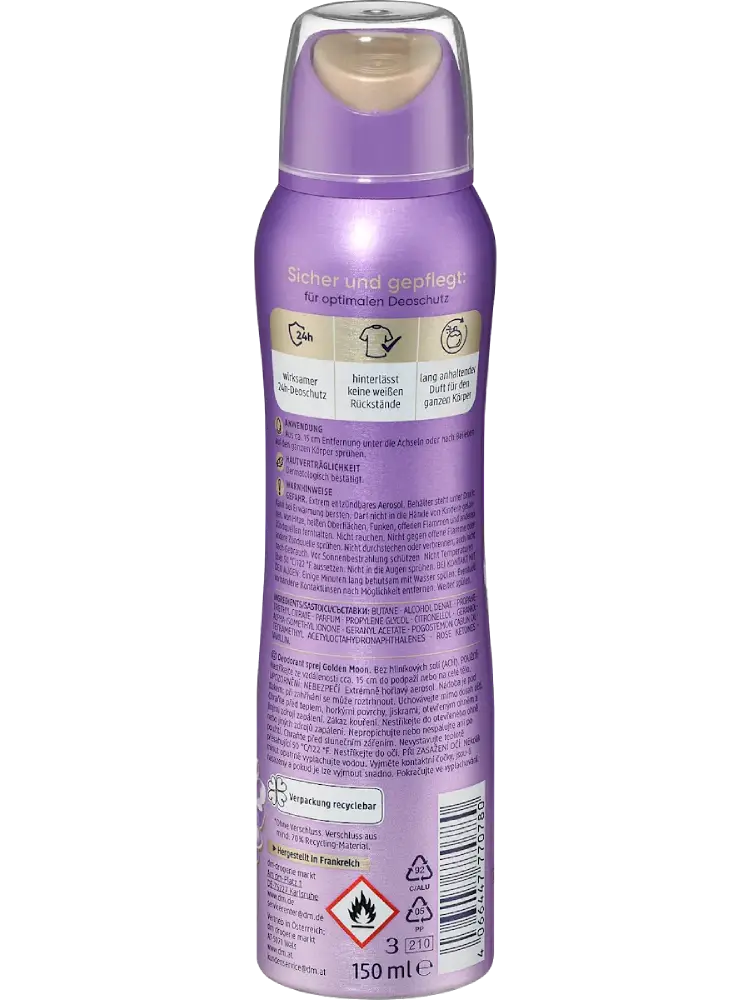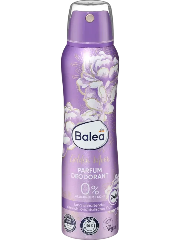 عناية وانتعاش طوال اليوم. يمنح مزيل العرق المعطر Golden Moon من Balea رائحة منعشة تدوم طويلاً. وبفضل عطره الحسي بطابع شرقي، يوفر حماية فعالة من الروائح حتى 24 ساعة. كما أنه لا يترك أي آثار بيضاء على البشرة أو الملابس.