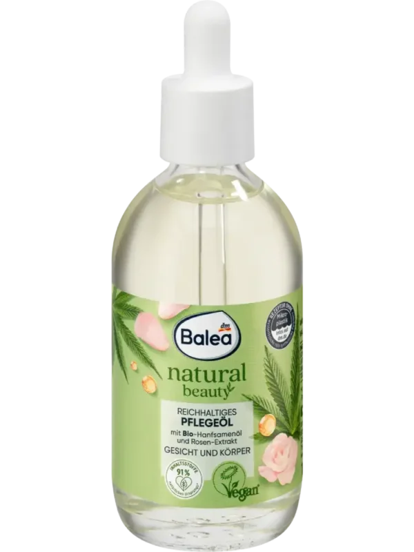 زيت العناية Balea Natural Beauty Bio مناسب للوجه والجسم. يعمل زيت بذور القنب العضوي القيّم ومستخلص الورد على تدليل البشرة وجعلها ناعمة وملساء. تم تأكيد توافقه مع البشرة جلدياً.