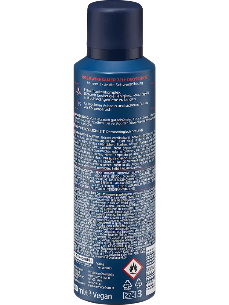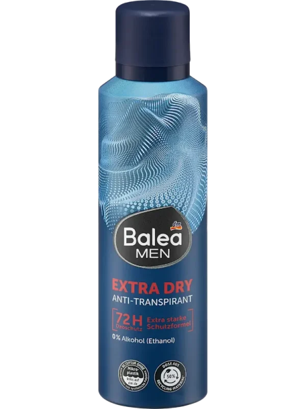 يتميز بخاخ مضاد التعرق Extra Dry من Balea MEN بتركيبة حماية قوية تدوم حتى 72 ساعة. تركيبته المطورة خصيصًا خالية من الميكروبلاستيك والكحول والمكونات الحيوانية، مما يجعله لطيفًا على البشرة. بفضل مركب الجفاف الإضافي، يساعد على امتصاص الرطوبة والتخلص من الروائح غير المرغوب فيها، ويوفر إحساسًا منعشًا يدوم طويلاً.