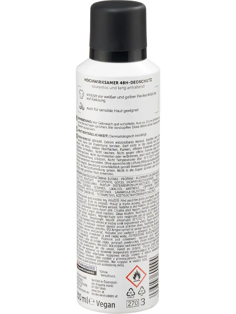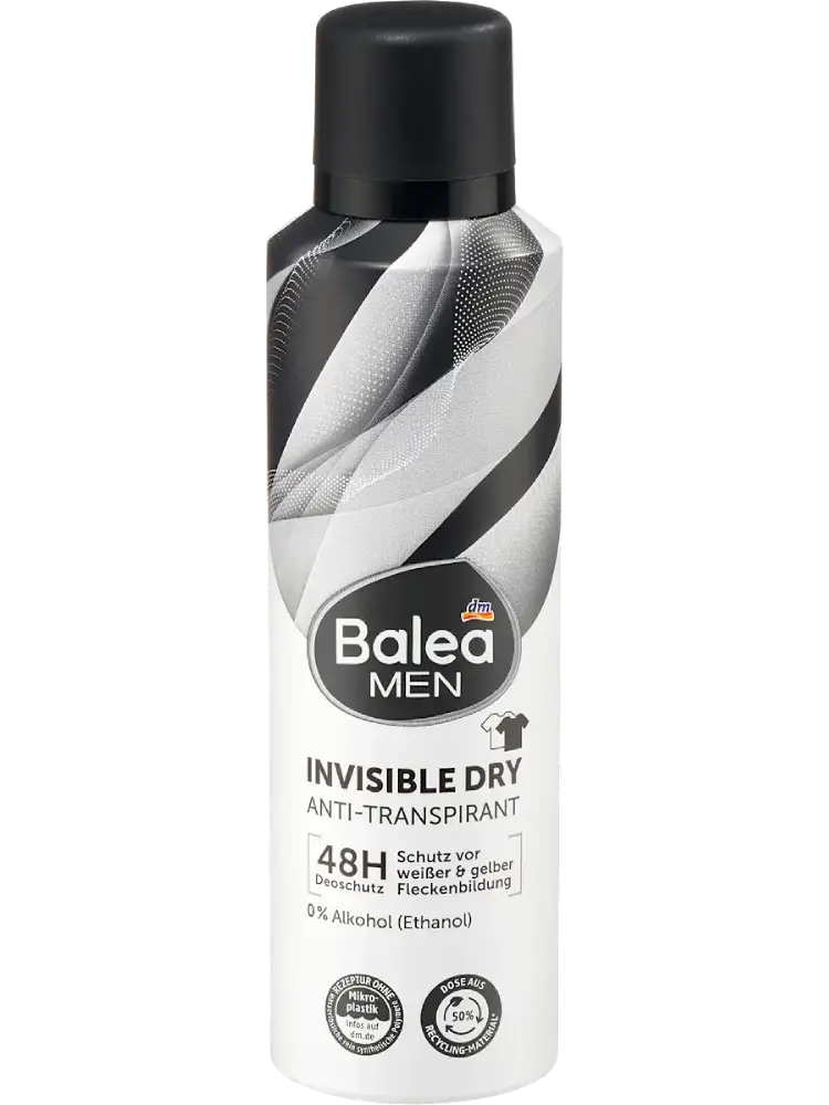 Avec le déodorant antitranspirant en spray Invisible Dry de Balea Men, une protection complète contre les mauvaises odeurs est assurée sans laisser de traces. Sa formule finement élaborée procure une agréable sensation de fraîcheur jusqu’à 48 heures, sans provoquer de taches jaunes ou blanches sur les vêtements. Le déodorant est présenté dans un emballage composé à 50 % de matériaux recyclés.