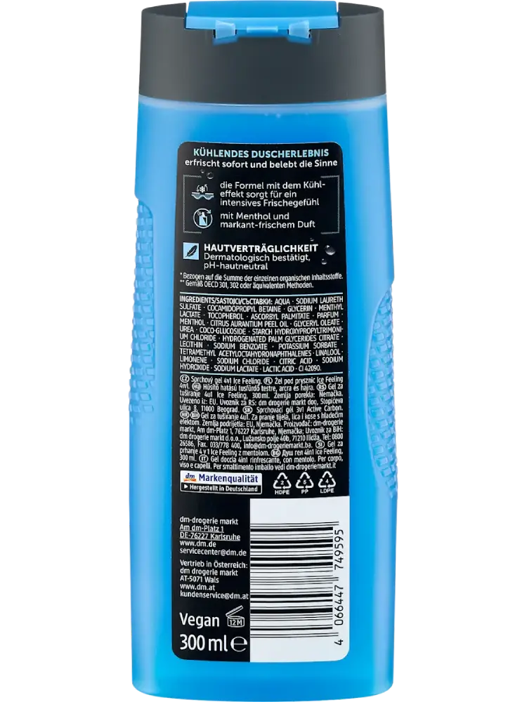 Le gel douche Ice Feeling de Balea MEN permet de gagner de la place grâce à sa formule 4 en 1, adaptée au corps, au visage et aux cheveux. Sa formule contient du menthol rafraîchissant, offrant au corps un effet fraîcheur stimulant chaque matin pour bien commencer la journée. En plus de son effet cooling, ce gel douche possède un parfum masculin et frais qui revitalise intensément les sens.