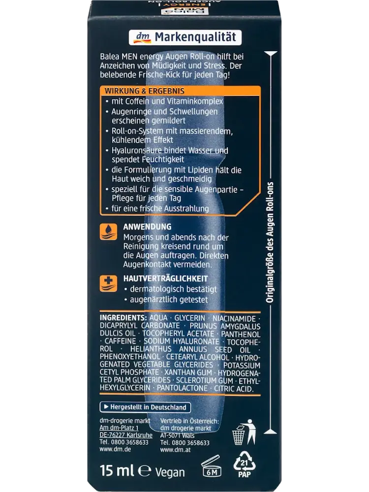 يمنح رول العين Energy من Balea MEN عيونك المتعبة جرعة انتعاش يومية. يحتوي على مركب فيتامينات، كافيين وحمض الهيالورونيك يساعد في تقليل الهالات السوداء وعلامات التعب والإجهاد. يوفّر نظام الرول تأثيرًا مبردًا. تركيبة خالية من الميكروبلاستيك والبوليمرات الاصطناعية القابلة للذوبان في الماء.