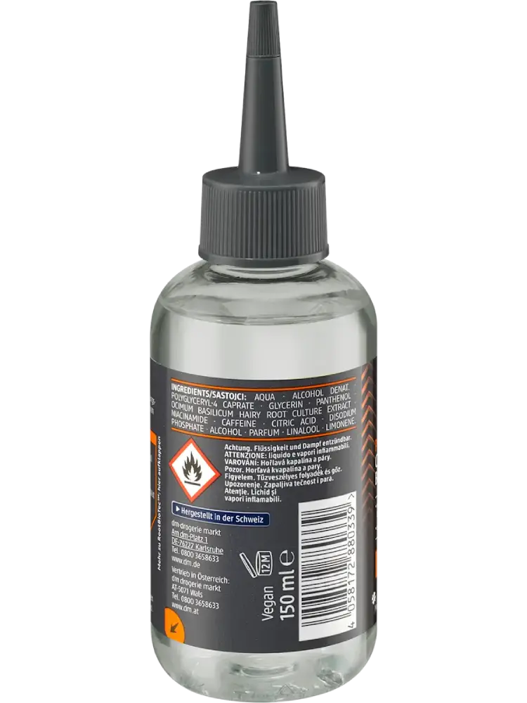Souffrez-vous de chute de cheveux héréditaire ? Le tonique Power Effect Coffein Boost de Balea MEN peut aider à réduire la chute des cheveux. Le complexe actif unique à base de caféine et RootBio Tec pénètre profondément jusqu’à la racine du cheveu et renforce les racines afin de prévenir la chute des cheveux.* La formule performante contient également du panthénol, qui soigne et rafraîchit le cuir chevelu. Ce soin professionnel est exempt de microplastiques et de polymères synthétiques solubles dans l’eau. Avec cette petite arme miracle, attaquez le problème à la racine et ne laissez aucune chance à la chute des cheveux !