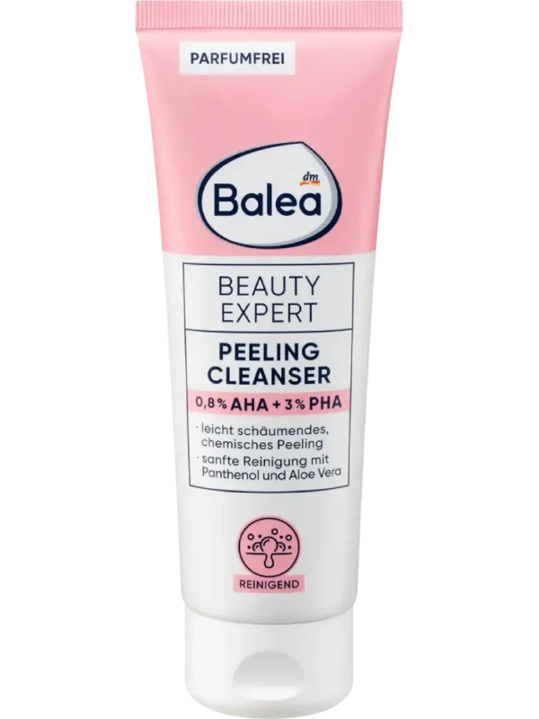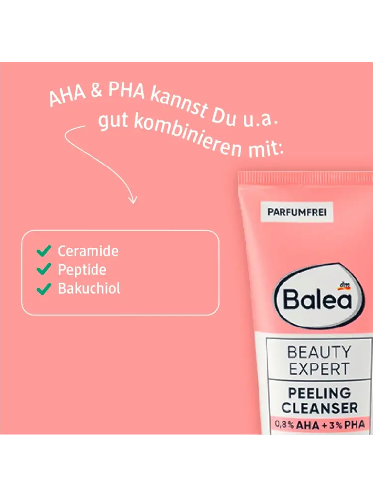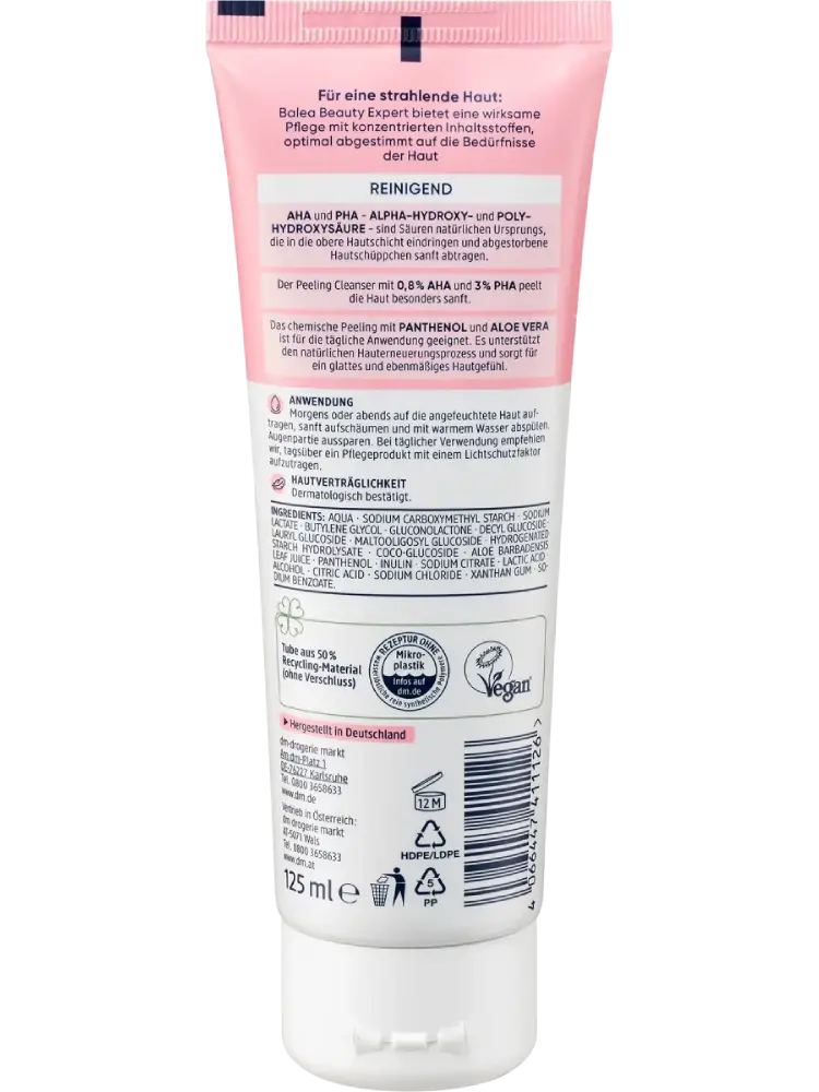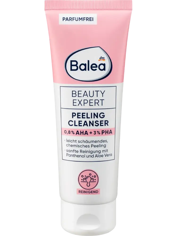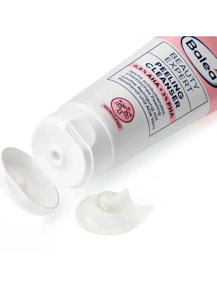 Le Beauty Expert Peeling Cleanser de Balea offre un soin efficace avec des ingrédients concentrés, parfaitement adaptés aux besoins de la peau. Les AHA et PHA – acides alpha-hydroxylés et poly-hydroxylés – sont des acides d’origine naturelle qui pénètrent la couche supérieure de la peau et éliminent en douceur les cellules mortes. Le nettoyant exfoliant, avec 0,8 % d’AHA et 3 % de PHA, exfolie la peau tout en douceur. Ce peeling chimique au panthénol et à l’aloe vera convient à un usage quotidien. Il soutient le processus naturel de renouvellement cutané et procure une peau lisse et uniforme.