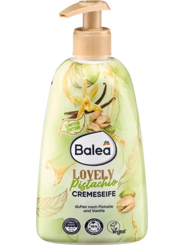 مع صابون Balea السائل Lovely Pistachio ينتشر في الحمام عطر لطيف من الفستق والفانيليا. وبفضل تركيبته اللطيفة فهو مناسب بشكل خاص للبشرة الحساسة ويترك إحساسًا مريحًا ومعتنى به بعد غسل اليدين.