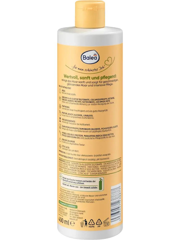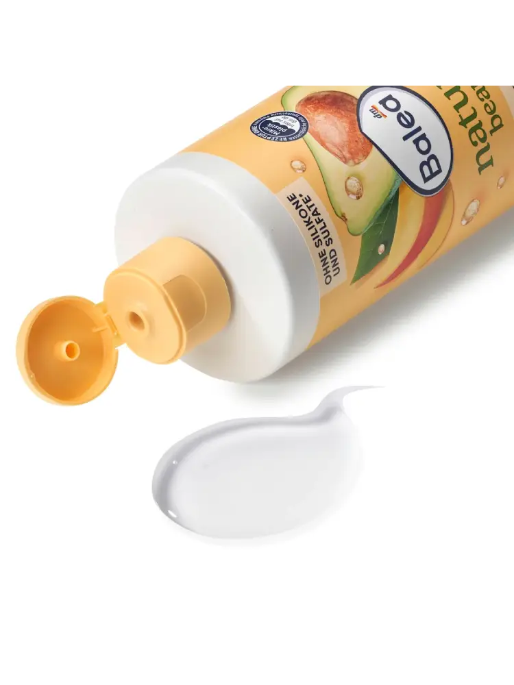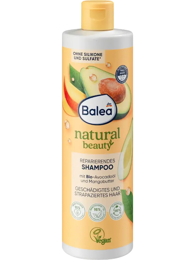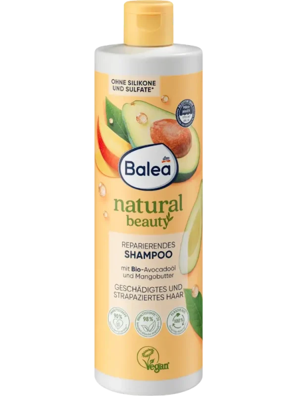 ينظف شامبو Balea Natural Beauty المُرمِّم الذي يحتوي على زيت الأفوكادو العضوي وزبدة المانجو الشعر بلطف ويمنحه عناية مكثفة. كما يساعد على جعل الشعر أكثر نعومة ولمعانًا وتغذية.