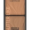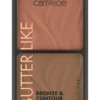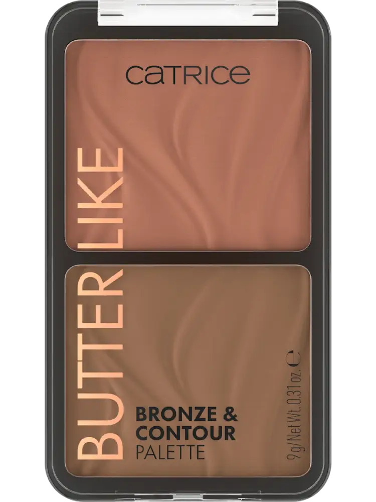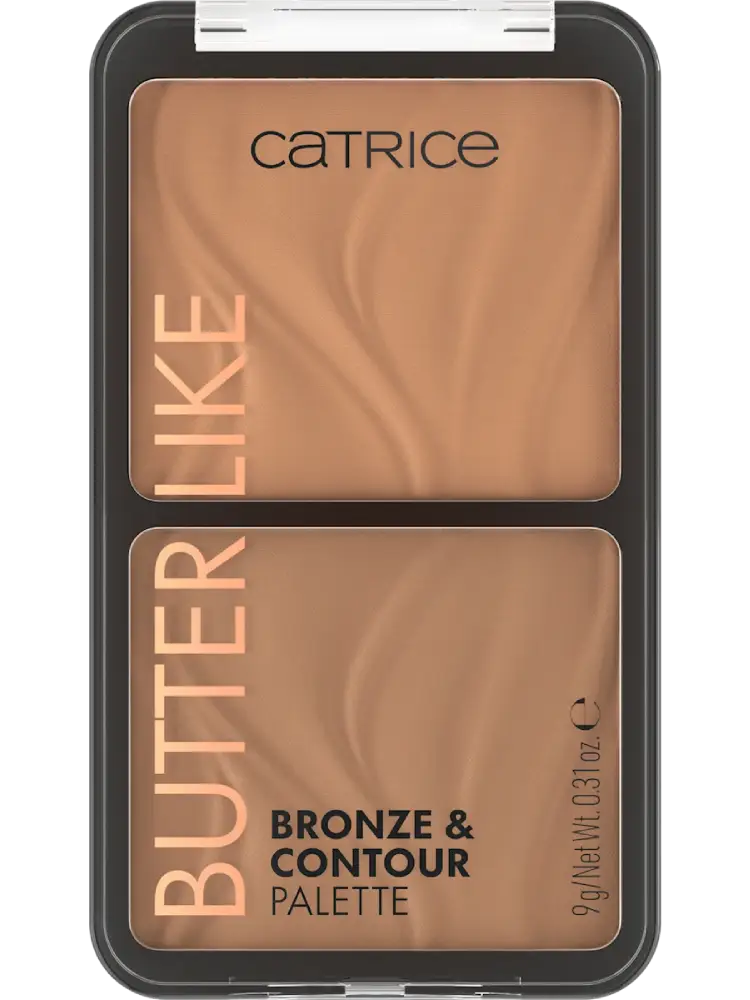 تجمع باليت Catrice Butter Like Bronze & Contour بدرجتي 010 Born أو 020 It My Way بين درجة برونزر دافئة ودرجة كونتور باردة في لوحة عملية.