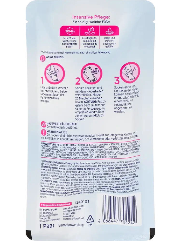 Pour la peau stressée des pieds Avec du panthénol, de l’huile d’avocat et un complexe actif hydratant Contient 10% d’urée Le masque pour les pieds à l’urée de Balea est idéal pour traiter la peau stressée des pieds. Le masque contient du panthénol, de l’huile d’avocat et un complexe d’actifs hydratants qui apporte à la peau une hydratation intense. Le masque nourrit intensément et laisse la peau lisse et douce. Formulation sans microplastiques et polymères purement synthétiques hydrosolubles.