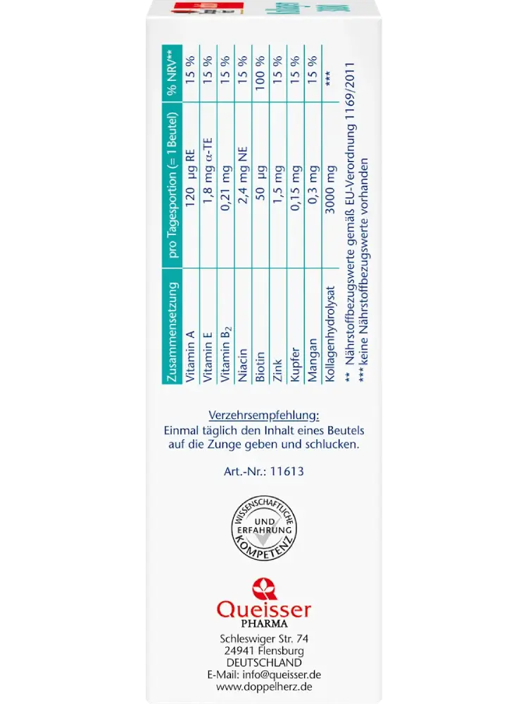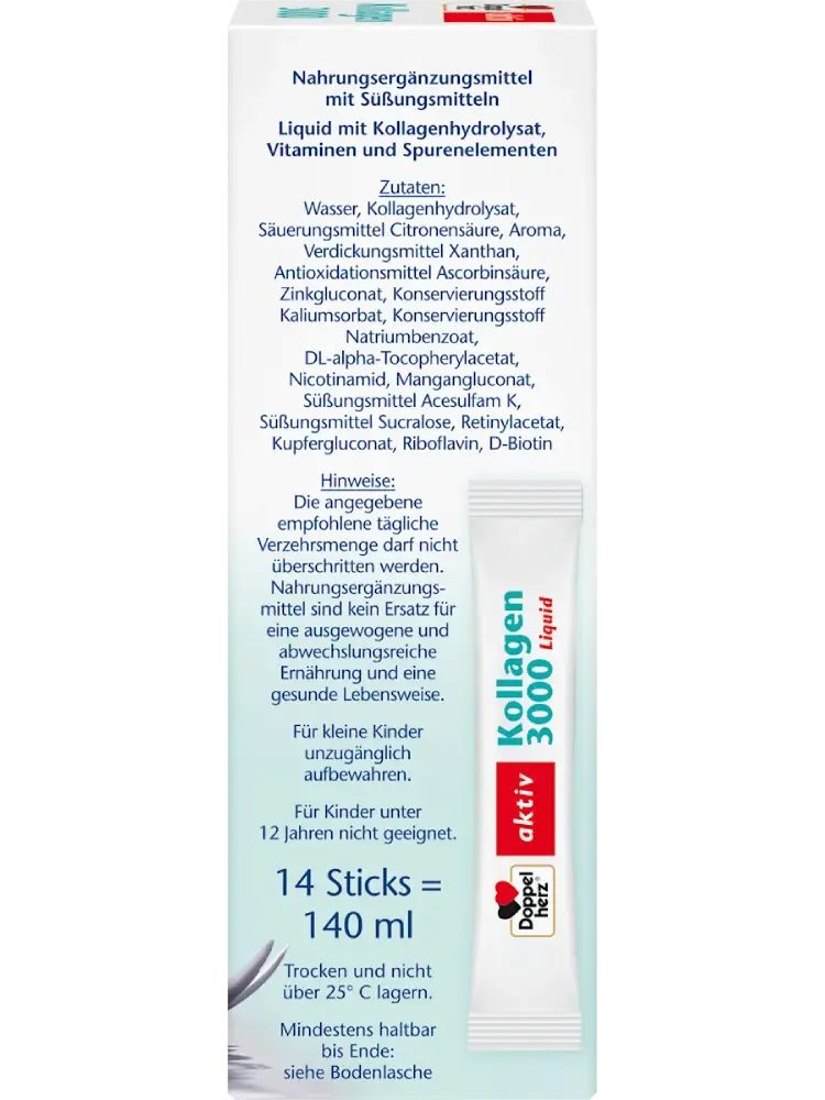 تحتوي أعواد الكولاجين السائل 3.000 من Doppelherz على فيتامين A والبيوتين والزنك لدعم البشرة الطبيعية. كما يُساهم المنغنيز في التكوين السليم للأنسجة الضامة.