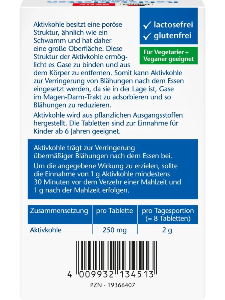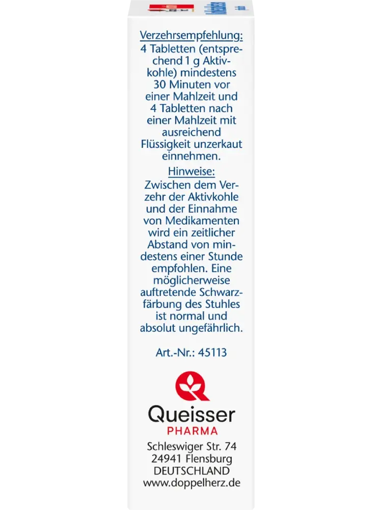 يمكن لأقراص الفحم النشط من Doppelherz أن تساهم في تخفيف الانتفاخ المفرط بفضل الفحم النشط الموجود فيها. تسمح بنية الفحم النشط بربط الغازات وبالتالي تقليل الانتفاخ. للحصول على هذا التأثير، يجب تناول 1 غرام من الفحم النشط قبل تناول الطعام بـ 30 دقيقة على الأقل، و1 غرام بعد الأكل. الأقراص مناسبة للأطفال من سن 6 سنوات فما فوق.
