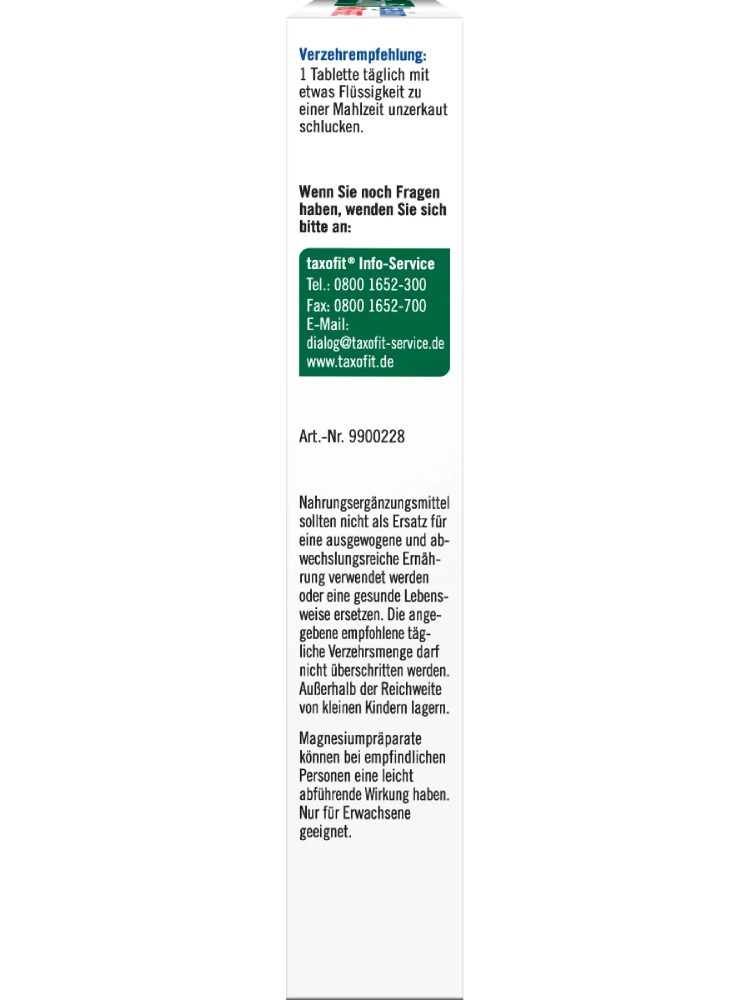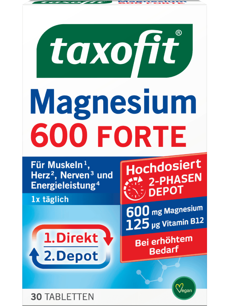 TAXOFIT Magnésium 600 FORTE, avec son magnésium hautement dosé et ses vitamines B1, B6 et B12, offre un soutien lors des activités sportives et des défis professionnels. Idéal pour ceux qui mènent une vie active avec engagement et détermination, tout en prenant soin de leur corps. Le magnésium et les vitamines soutiennent la fonction normale des muscles, le métabolisme énergétique ainsi que le système nerveux – pour un mode de vie actif.