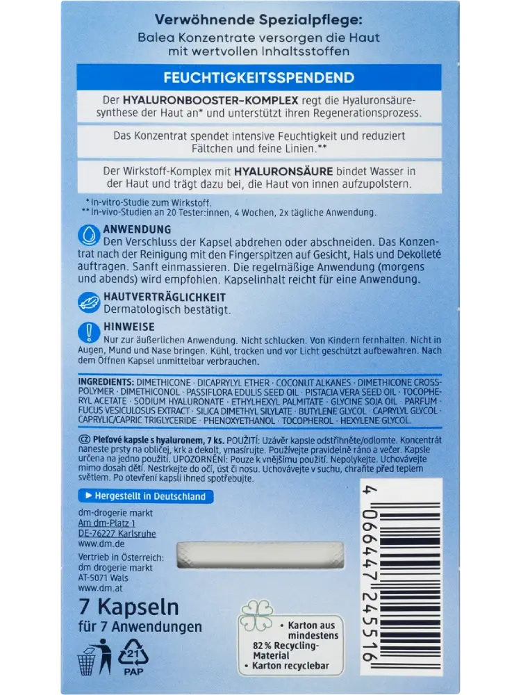 يمنح مركز حمض الهيالورونيك من Balea ترطيبًا مكثفًا ويساعد في تقليل التجاعيد والخطوط الدقيقة.** يعمل مركب تعزيز حمض الهيالورونيك على تحفيز إنتاج البشرة الطبيعي لهذا الحمض* ويدعم عملية تجديد البشرة. بالإضافة إلى ذلك، يعمل المركب الفعّال مع حمض الهيالورونيك على حبس الماء داخل البشرة، ما يساعد في منحها مظهرًا ممتلئًا من الداخل.