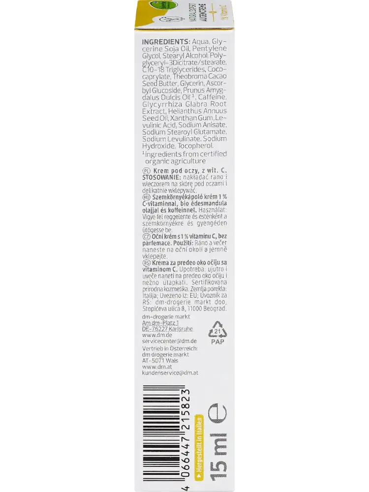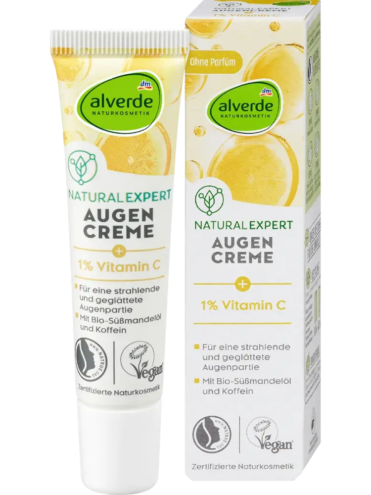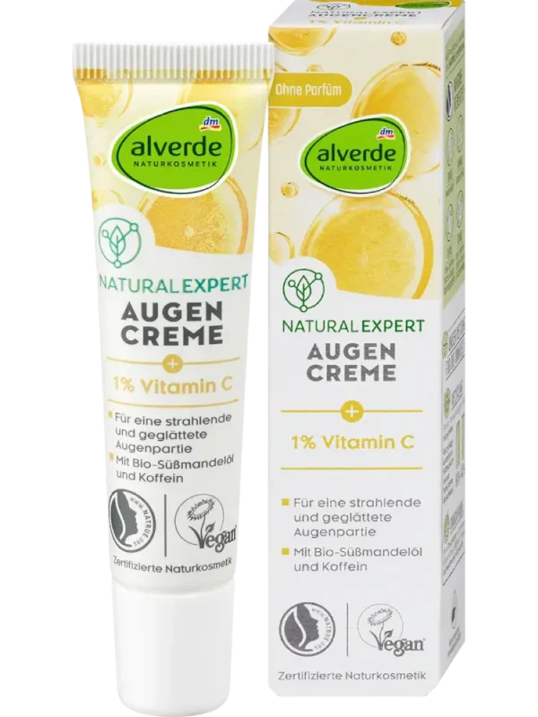 يُعد كريم العين بفيتامين C من Natural Expert من alverde NATURKOSMETIK كريمًا خفيفًا وفعّالًا في العناية بمنطقة العين. تحتوي تركيبته على 1% فيتامين C، ما يساعد على تفتيح وتنعيم محيط العين.