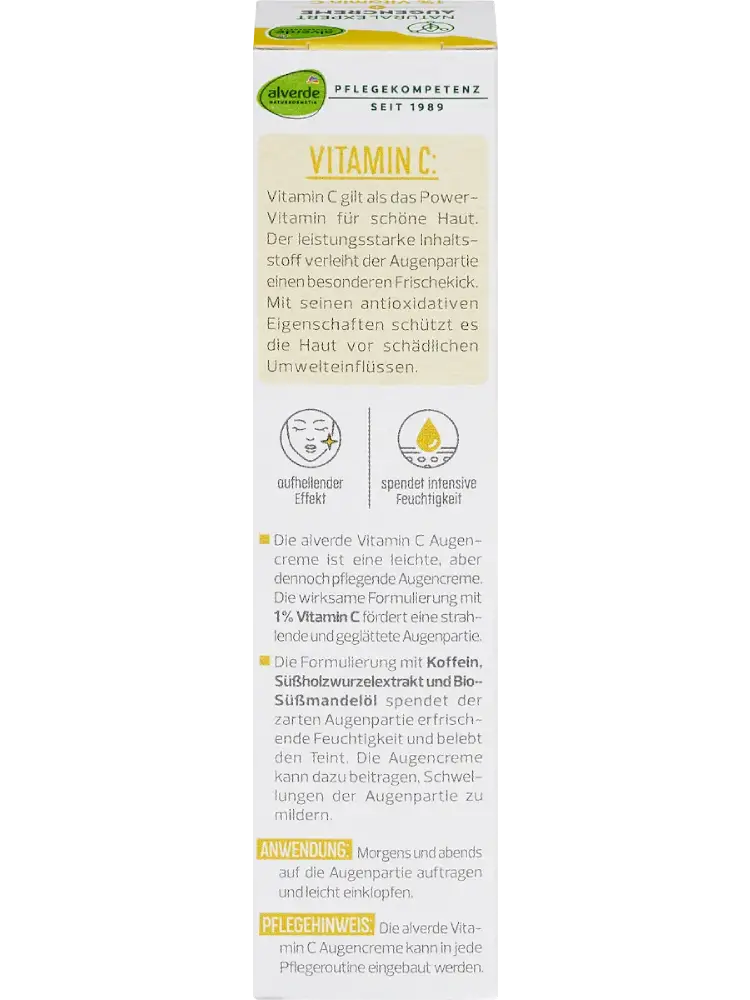 La crème contour des yeux à la vitamine C Natural Expert de alverde NATURKOSMETIK est une crème légère mais nourrissante. Sa formule avec 1 % de vitamine C illumine et lisse le contour des yeux.