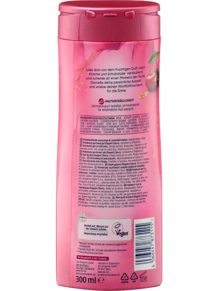 La crème de douche Elegant Cherry de Balea transforme l’expérience de la douche en une véritable parenthèse sensorielle. Son parfum séduisant de cerise et de chocolat enveloppe la peau et procure un pur moment de détente. Sa texture crémeuse nettoie en douceur et laisse une sensation agréable sur la peau. Grâce à sa tolérance cutanée confirmée dermatologiquement, elle convient également aux peaux sensibles et est parfaite pour un usage quotidien. Pour une touche de luxe et de bien-être chaque jour.