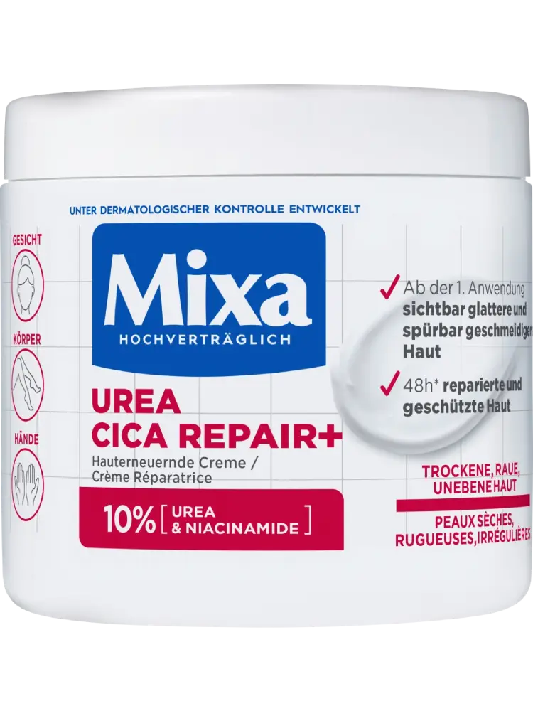 La crème régénérante Mixa Urea Cica Repair est un soin hautement concentré pour le visage, le corps et les mains. Spécialement conçue pour les peaux sèches, rugueuses et irrégulières, elle procure une peau visiblement plus lisse et plus douce dès la première application.