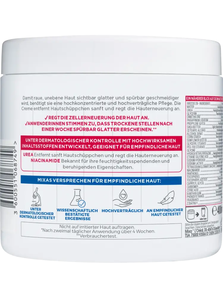 Sa formule contient 10 % d’urée et des niacinamides, qui nourrissent la peau en profondeur et la protègent durablement contre les irritations et les agressions extérieures.