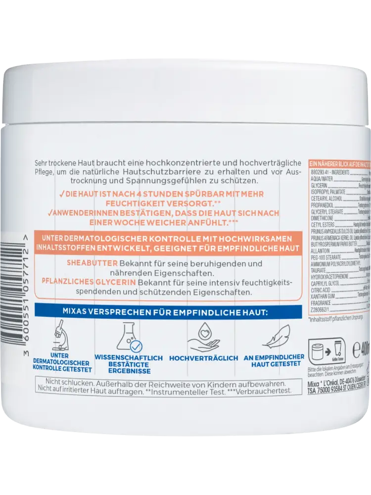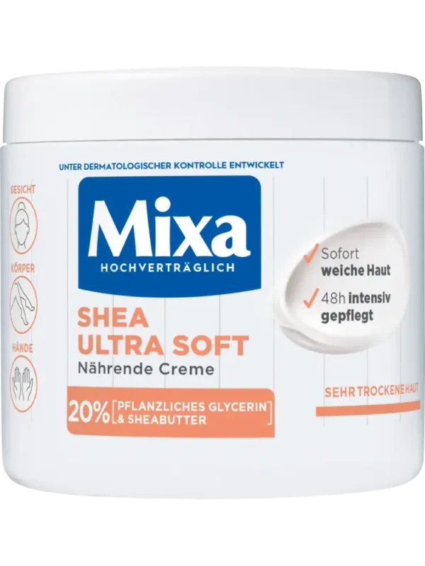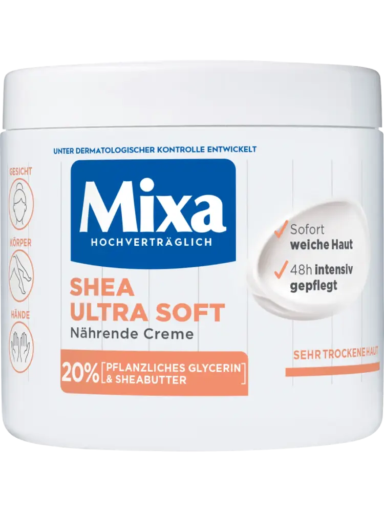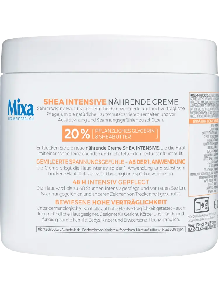 La crème de soin riche Shea Intensif de Mixa a été spécialement conçue pour les peaux très sèches. Grâce à sa formule contenant 20 % de glycérine végétale et du beurre de karité, elle procure une douceur durable pour toute la famille.