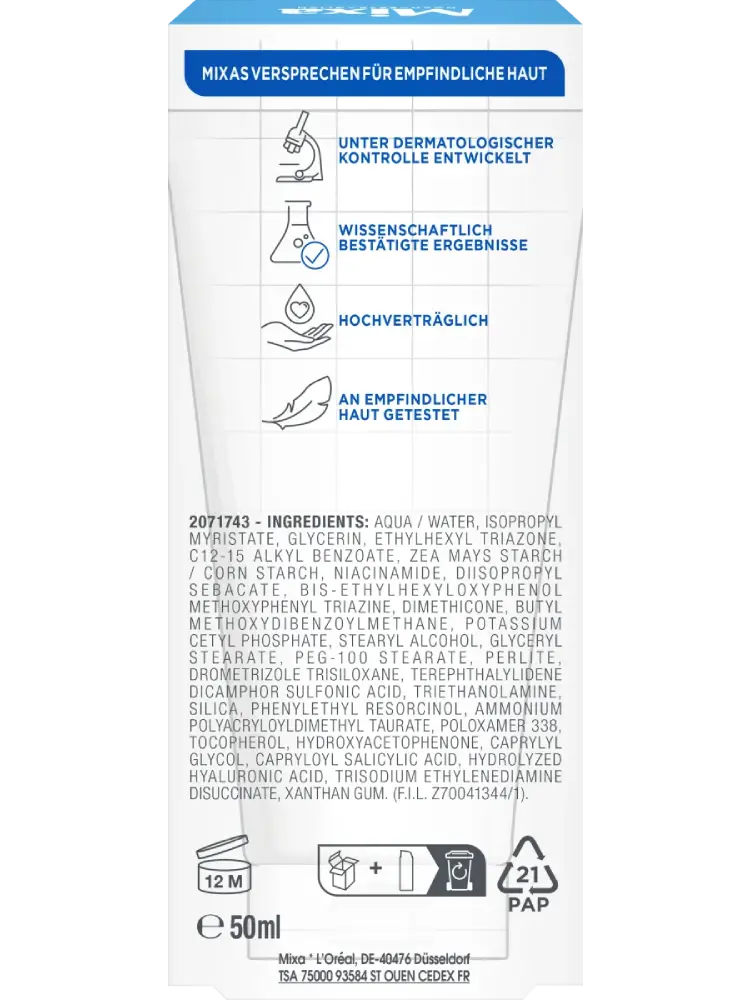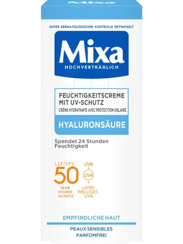 كريم الترطيب من Mixa بعامل حماية من الشمس 50 وحماية من الأشعة فوق البنفسجية يعد أساساً مثالياً لروتين العناية بالبشرة الحساسة. بالإضافة إلى ذلك، يمكن أن يساهم كريم الوجه في الوقاية من شيخوخة البشرة المبكرة ويمنحها ترطيباً يصل إلى 24 ساعة.
