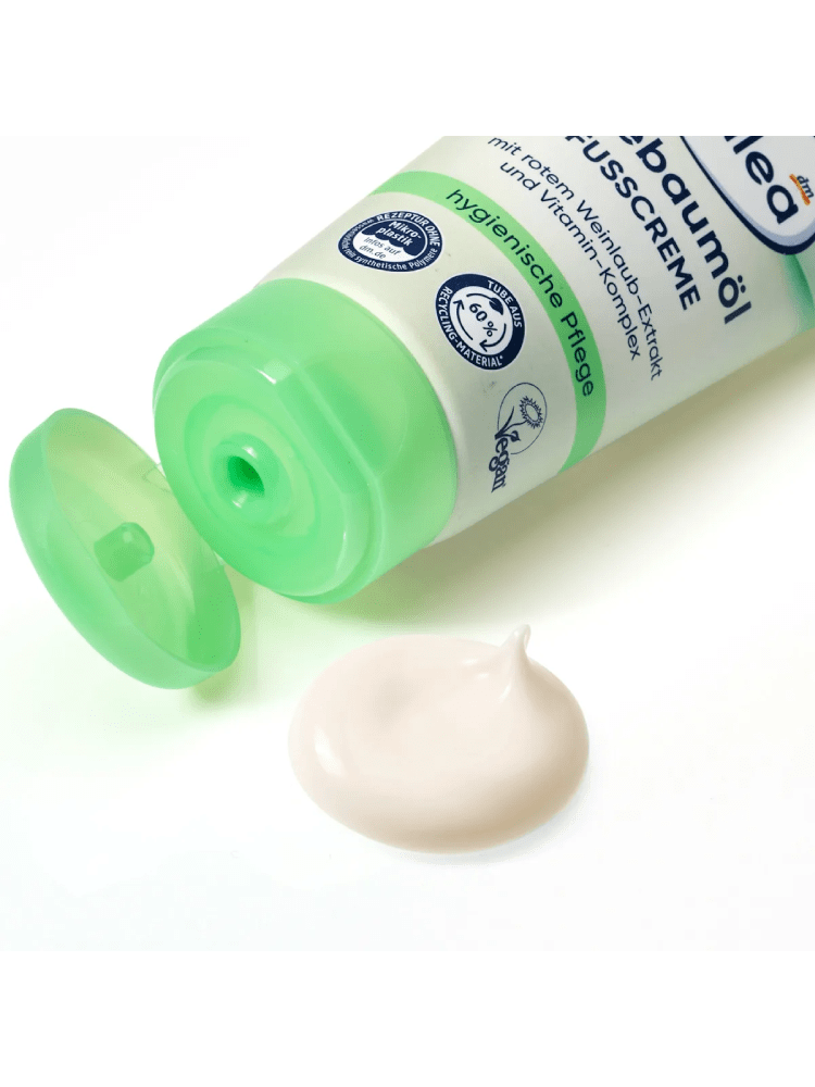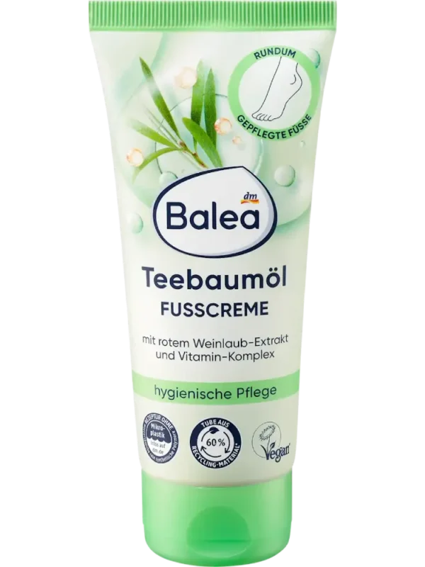 Die Balea Fußcreme schenkt mit Teebaumöl, rotem Weinlaub-Extrakt und einem Vitamin-Komplex ein hygienisches und gepflegtes Gefühl. Die erfrischende Pflege sorgt für seidig-weiche Füße und vitalisiert erschöpfte Füße sowie Beine. Auch ist die Textur komplett vegan und ihre Hautverträglichkeit wurde dermatologisch bestätigt. Für ein rundum frisches Fußgefühl. Rezeptur ohne Mikroplastik & wasserlösliche rein synthetische Polymere.