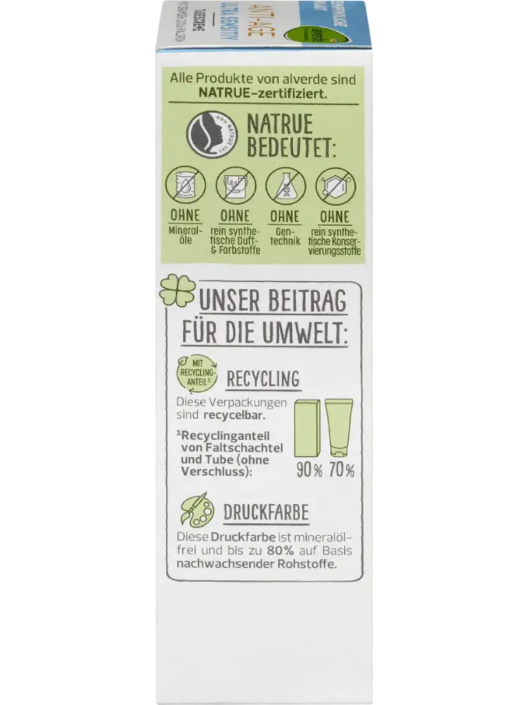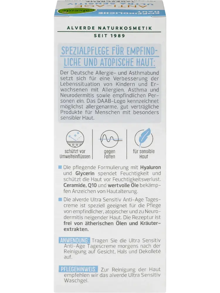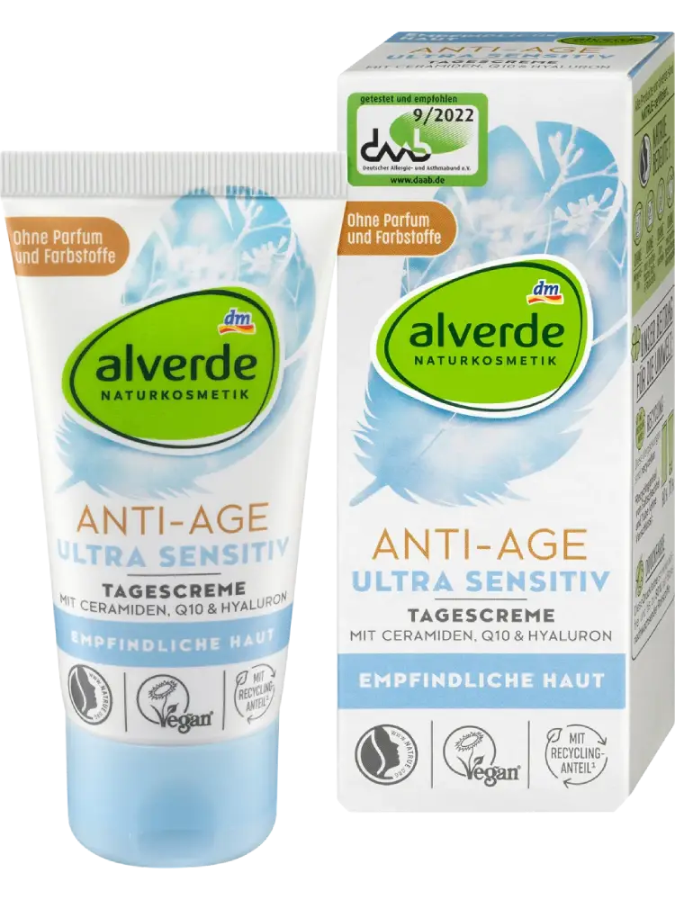 كريم النهار المضاد للشيخوخة فائق الحساسية من alverde NATURKOSMETIK مصمم خصيصاً للعناية بالبشرة الحساسة، المعرضة للإكزيما والتهاب الجلد التأتبي. التركيبة خالية من الزيوت العطرية ومستخلصات الأعشاب. التركيبة المغذية ترطب البشرة وتحميها من فقدان الرطوبة. تساعد السيراميدات، Q10 والزيوت القيمة في مكافحة علامات الشيخوخة.