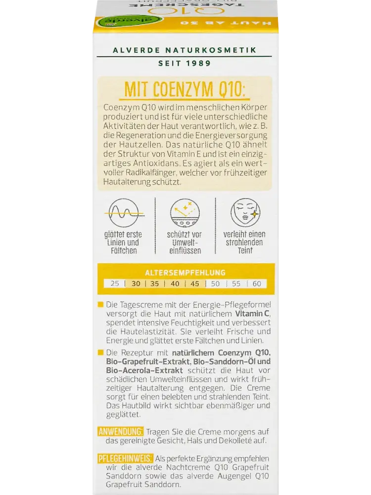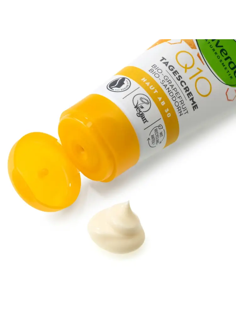 La crème de jour Q10 avec coenzyme naturel d’alverde NATURKOSMETIK protège la peau des agressions extérieures et prévient le vieillissement prématuré de la peau. La crème procure un teint revitalisé et éclatant. Le grain de peau paraît visiblement plus uniforme et lissé.