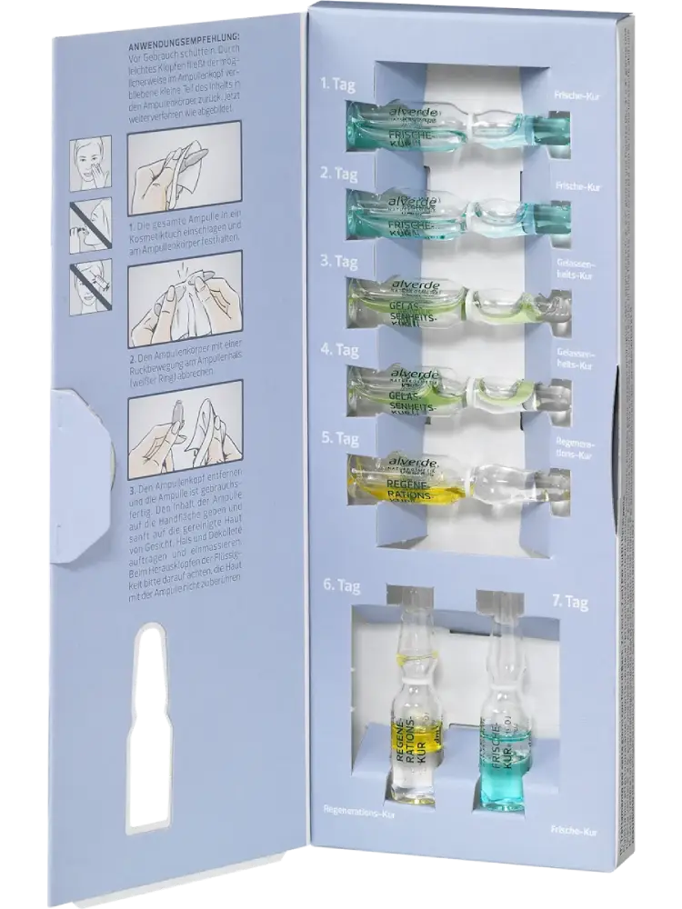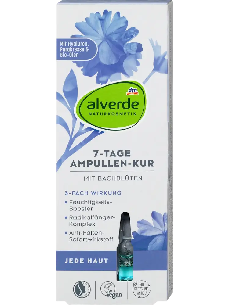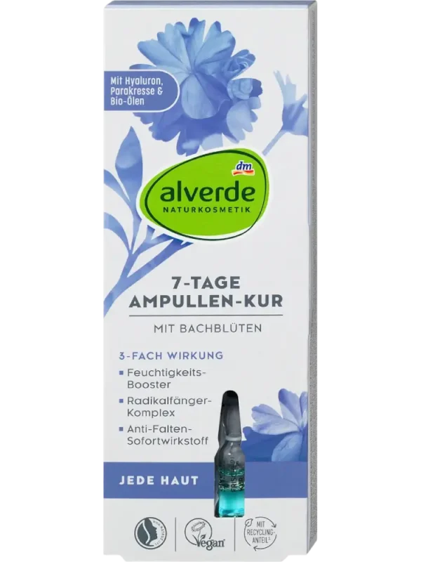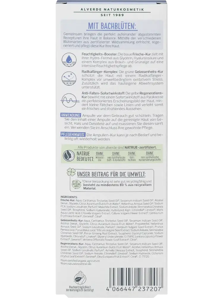 La cure d’ampoules 7 jours aux fleurs de Bach d’alverde Naturkosmetik harmonise la peau grâce à des formulations parfaitement coordonnées. Les différentes fleurs issues de cueillettes sauvages certifiées rafraîchissent, régénèrent et nourrissent la peau.