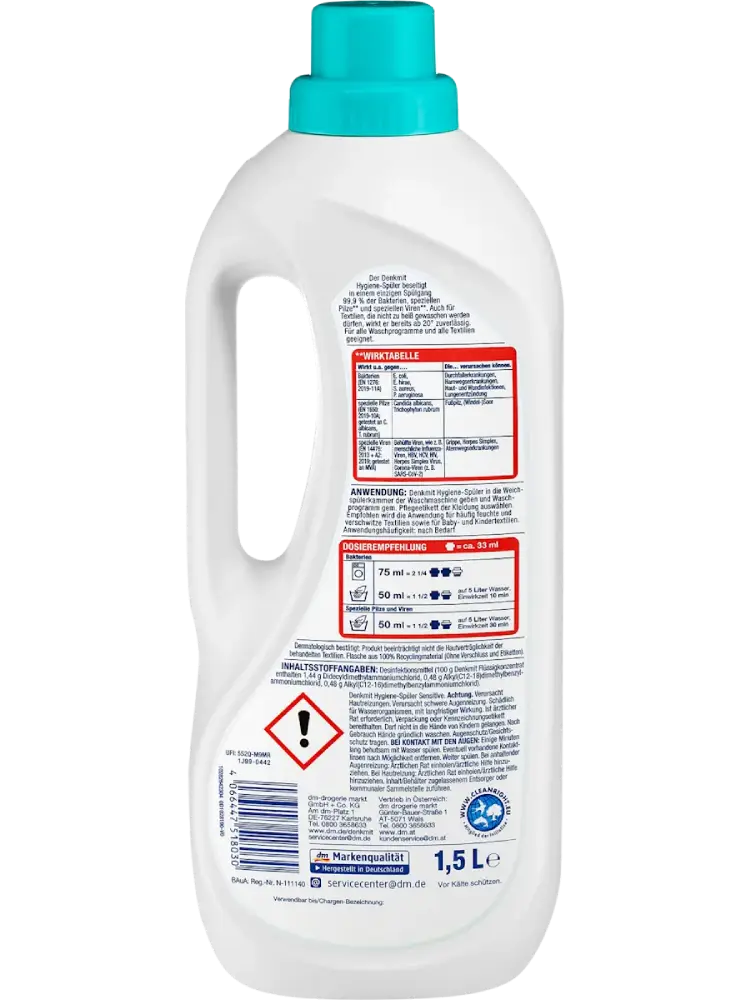 يضمن معقّم الغسيل من Denkmit نظافة صحية للملابس بدءًا من درجة حرارة 20° مئوية، ويقضي بفعالية على البكتيريا والفطريات والفيروسات الخاصة.